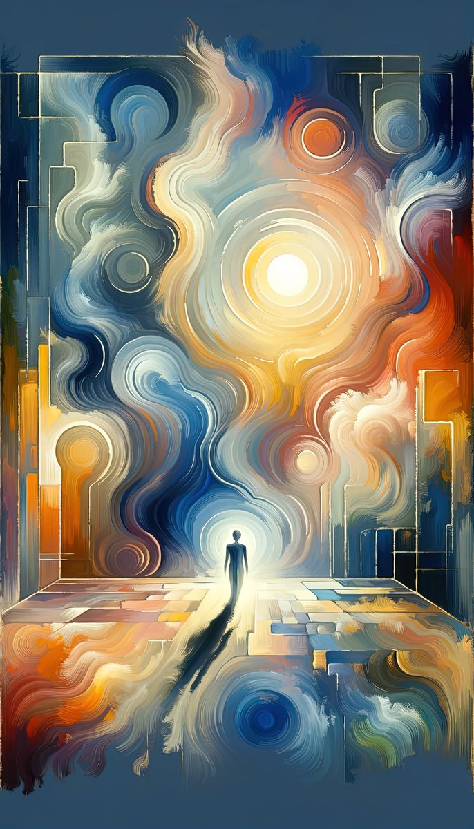 The image titled Spiritual Tranquil Sanctuary is a captivating vertical Tachism style painting that serves as a visual metaphor for Creating a sacred space. This abstract artwork beautifully melds a spectrum of luminous blues, warm oranges, and radiant yellows to embody the essence of spirituality and tranquility. At the heart of the painting, a glowing white orb, reminiscent of a radiant sun or a guiding light, draws the eye, exuding a profound sense of peace and enlightenment. Swirling patterns around the central light suggest movement and a dynamic flow of energy. These patterns guide the viewer s gaze throughout the canvas, simulating a spiritual journey towards inner peace. The lower-third of the painting introduces a solitary silhouette of a figure, standing at the entrance of this ethereal sanctuary. The figure s shadow trails behind, elongated and blending into the patterns of the floor, pointing towards the bright epicenter. The space around the figure is architecturally defined by sharp vertical and horizontal lines that contrast the organic swirls of color, adding an element of structure to the composition. The atmospheric perspective and reflective surfaces conjure a realm that is both otherworldly and inviting—a tranquil sanctuary where one can retreat from the chaos of the external world and connect with deeper universal truths. The painting is a visual symphony, harmonizing form and color to express a place of contemplation and serenity.