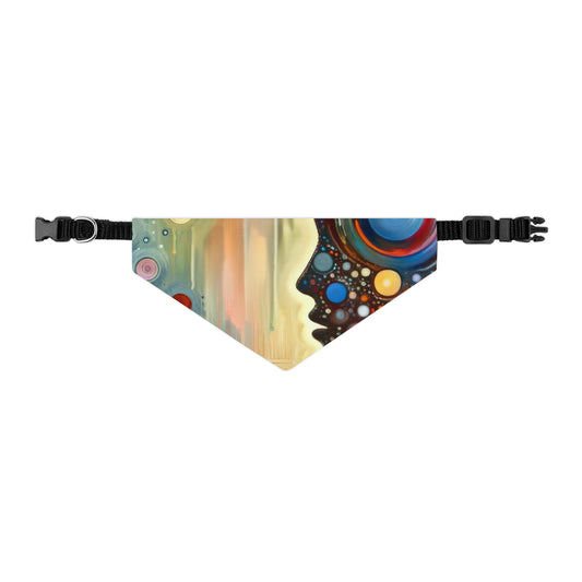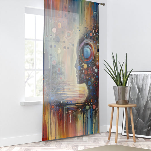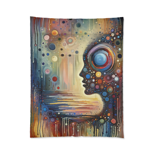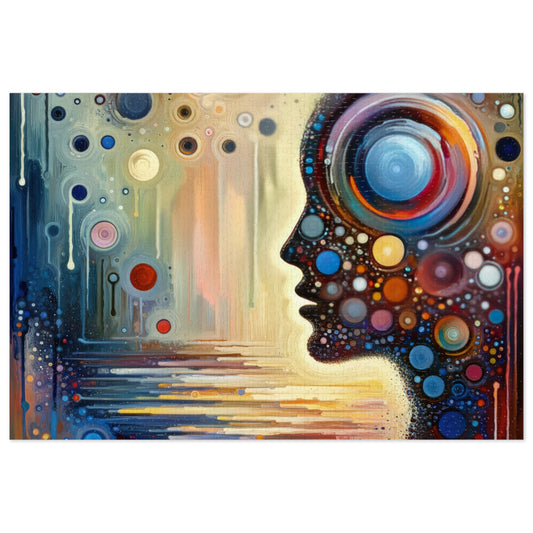 The image, titled Echoed Intrinsic Universality, is a captivating vertical composition in the Tachism style, brimming with symbolism and color. It vividly explores the concept of intrinsic wholeness within each person as a reflection of the universal collective. A rich tapestry of hues ranging from warm amber, crimson, and ochre to cool blues, greens, and violets creates a dynamic background. Within this chromatic whirlwind, streaks of paint cascade down the canvas, mimicking the effect of rain or tears of color. Amidst this abstraction, the silhouette of a human profile emerges on the right side, composed of numerous overlapping circles and dots that gradually increase in size to culminate in a large concentric circle, where the person s mind would be. This central vortex appears like an eye or portal, drawing the viewer into a deeper dimension of thought and contemplation. The circular elements throughout the piece suggest the atomic structure of matter or celestial bodies in the cosmos, bridging the micro and macro realms. The intricate layering and detailed dots create a visual rhythm, perhaps representing the interconnectedness of all things and the universal energy that flows through every individual. Overall, the artwork is an immersive experience, inviting us to consider our own place within the vast tapestry of the universe and to recognize the completeness and connectivity that lies at the core of our existence.
