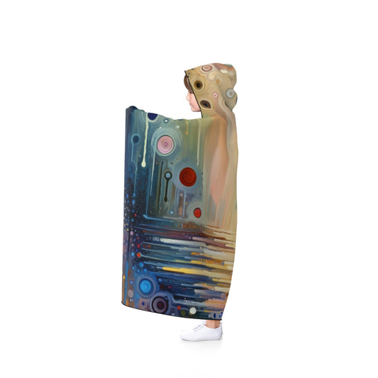 The image, titled Echoed Intrinsic Universality, is a captivating vertical composition in the Tachism style, brimming with symbolism and color. It vividly explores the concept of intrinsic wholeness within each person as a reflection of the universal collective. A rich tapestry of hues ranging from warm amber, crimson, and ochre to cool blues, greens, and violets creates a dynamic background. Within this chromatic whirlwind, streaks of paint cascade down the canvas, mimicking the effect of rain or tears of color. Amidst this abstraction, the silhouette of a human profile emerges on the right side, composed of numerous overlapping circles and dots that gradually increase in size to culminate in a large concentric circle, where the person s mind would be. This central vortex appears like an eye or portal, drawing the viewer into a deeper dimension of thought and contemplation. The circular elements throughout the piece suggest the atomic structure of matter or celestial bodies in the cosmos, bridging the micro and macro realms. The intricate layering and detailed dots create a visual rhythm, perhaps representing the interconnectedness of all things and the universal energy that flows through every individual. Overall, the artwork is an immersive experience, inviting us to consider our own place within the vast tapestry of the universe and to recognize the completeness and connectivity that lies at the core of our existence.