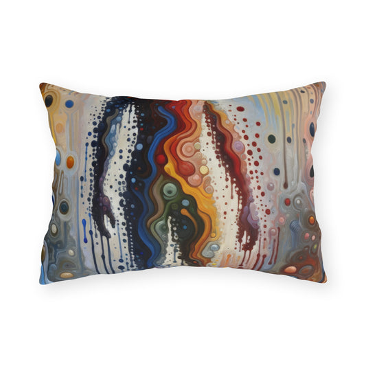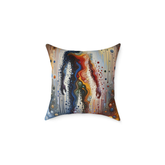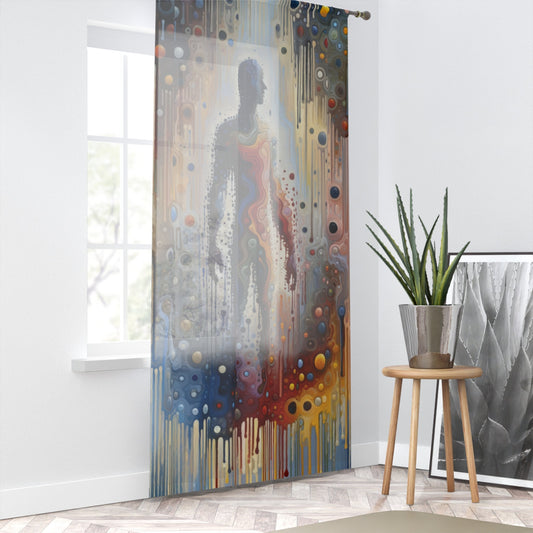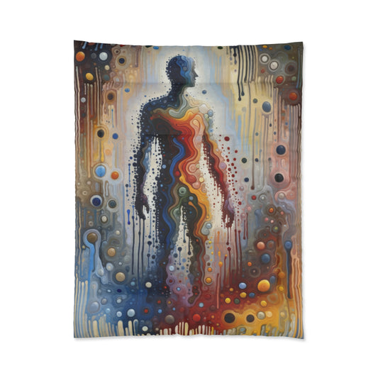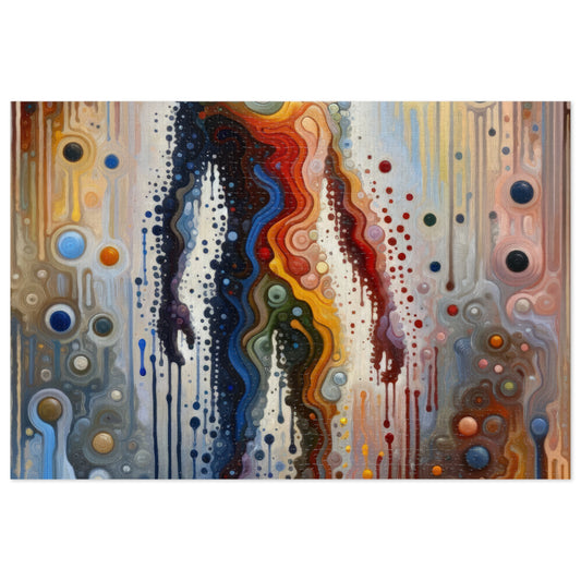 The image titled Connectedness Contours Wellness is a striking example of Tachism style art, presenting a highly stylized and abstract representation of a human figure against a backdrop rich in color and texture. The figure itself appears contemplative or poised, subtly emerging from the surrounding chaos of shapes and lines, suggesting a deep sense of introspection or perhaps meditative stillness. The background is a complex tapestry of dripping paint and circular forms that create an impression of both depth and motion. A palette of cool blues, grays, and whites dominate the upper and right side of the composition, while warmer hues of red, orange, yellow, and brown intermingle throughout the central and lower sections, evoking a sense of internal warmth and vitality. This melange of colors and shapes around the human figure could be seen to represent the individual s inner experiences, emotions, or the swirling thoughts one might have, reinforcing the notion of personal wellness and its connection to a more profound universal fabric. The use of a vertical format emphasizes the feeling of ascension or growth, while the fluidity and blending of the colors convey a seamless interplay between the individual and the world around them. Overall, the artwork is a visual metaphor for the interconnectedness that lies beneath the surface of individual well-being.