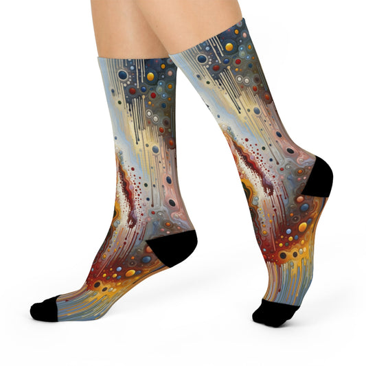 The image titled Connectedness Contours Wellness is a striking example of Tachism style art, presenting a highly stylized and abstract representation of a human figure against a backdrop rich in color and texture. The figure itself appears contemplative or poised, subtly emerging from the surrounding chaos of shapes and lines, suggesting a deep sense of introspection or perhaps meditative stillness. The background is a complex tapestry of dripping paint and circular forms that create an impression of both depth and motion. A palette of cool blues, grays, and whites dominate the upper and right side of the composition, while warmer hues of red, orange, yellow, and brown intermingle throughout the central and lower sections, evoking a sense of internal warmth and vitality. This melange of colors and shapes around the human figure could be seen to represent the individual s inner experiences, emotions, or the swirling thoughts one might have, reinforcing the notion of personal wellness and its connection to a more profound universal fabric. The use of a vertical format emphasizes the feeling of ascension or growth, while the fluidity and blending of the colors convey a seamless interplay between the individual and the world around them. Overall, the artwork is a visual metaphor for the interconnectedness that lies beneath the surface of individual well-being.