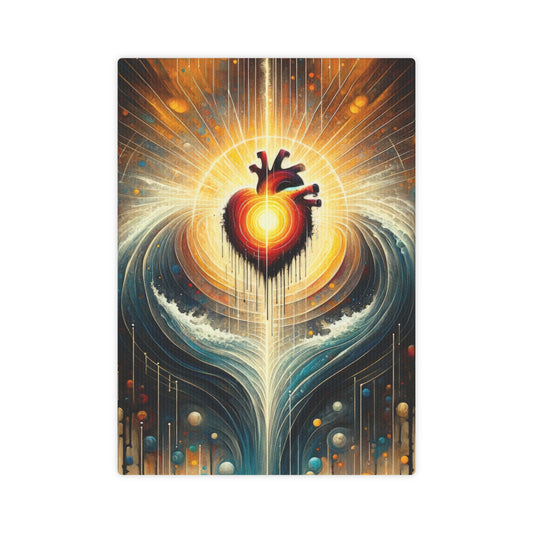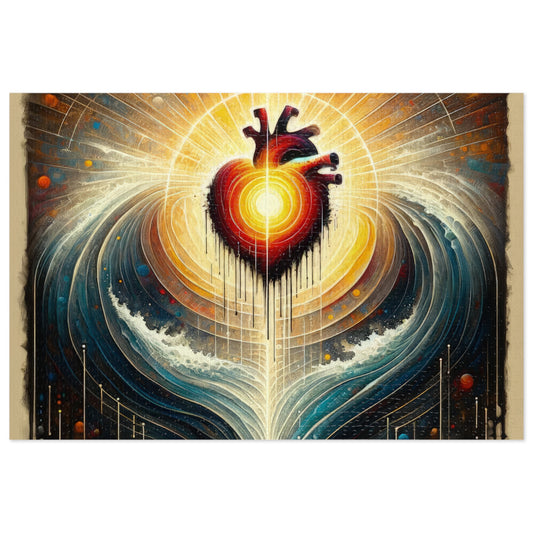 The artwork titled Awakened Heart Waves is a vertical image rendered in a Tachism style, encapsulating the essence of an awakening that ripples outwards, instigating change. At the center, an anatomical heart glows with an inner light, its striking reds and warm oranges contrasting against the surrounding hues. From this luminous core, radiant beams emerge, symbolizing enlightenment emanating from an awakened soul. These beams of light dive into a dynamic swirl of blues and whites, creating a visual metaphor for a wave of change. The wave is carefully crafted with a sense of fluid movement, which gives the impression of an actual undulating ocean sparked into motion by the stirring heart. The textured background above the heart descends into darkness with vertical streaks of color that resemble falling rain or perhaps the cosmic trails of shooting stars, adding to the abstract and mystical atmosphere. Below, the imagery subtly transitions to a peaceful mixture of soft colors, dotted with circular shapes that might be seen as droplets or orbs, implying a grounding and calming influence after the initial surge. Throughout the image, the interplay of vivid colors and abstract forms combine to convey the expansive and transformative power of an awakened heart, illustrating the belief that personal transformation can precede and catalyze broader shifts in the world.