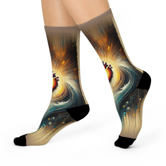 The artwork titled Awakened Heart Waves is a vertical image rendered in a Tachism style, encapsulating the essence of an awakening that ripples outwards, instigating change. At the center, an anatomical heart glows with an inner light, its striking reds and warm oranges contrasting against the surrounding hues. From this luminous core, radiant beams emerge, symbolizing enlightenment emanating from an awakened soul. These beams of light dive into a dynamic swirl of blues and whites, creating a visual metaphor for a wave of change. The wave is carefully crafted with a sense of fluid movement, which gives the impression of an actual undulating ocean sparked into motion by the stirring heart. The textured background above the heart descends into darkness with vertical streaks of color that resemble falling rain or perhaps the cosmic trails of shooting stars, adding to the abstract and mystical atmosphere. Below, the imagery subtly transitions to a peaceful mixture of soft colors, dotted with circular shapes that might be seen as droplets or orbs, implying a grounding and calming influence after the initial surge. Throughout the image, the interplay of vivid colors and abstract forms combine to convey the expansive and transformative power of an awakened heart, illustrating the belief that personal transformation can precede and catalyze broader shifts in the world.