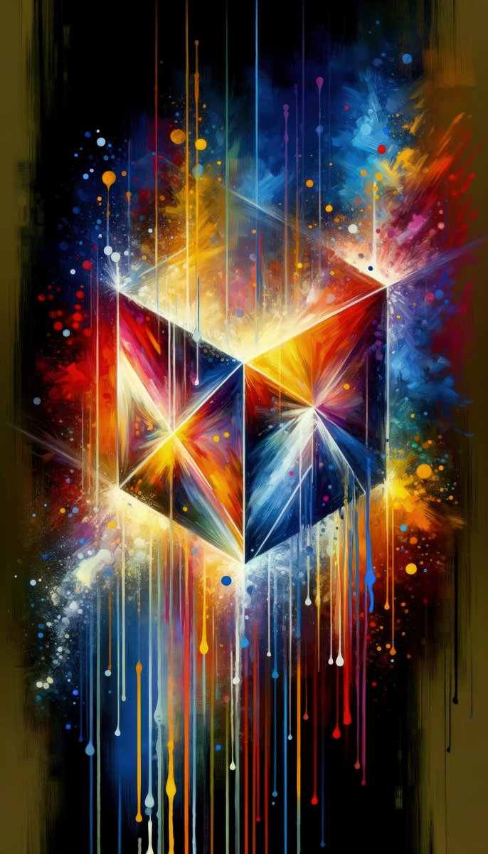 The artwork titled Prismatic Light Spectrum is a striking vertical image rendered in a Tachism style, symbolically representing the concept of holding a prism to the light. In the center of the composition sits a geometric prism radiating vibrant, multicolored rays of light in all directions, suggesting the breaking of white light into a spectrum of colors—a visual metaphor for the dispersion of light. Each facet of the prism bursts with an intense luminescence of reds, yellows, blues, and oranges, intersecting and overlapping to create a dynamic interplay of shades and tones. Illuminated as if from behind, the prism seems to glow against a contrasting backdrop of a dark, nebulous space that could evoke the vastness of the cosmos. Streaks of paint appear to drip downward from the spectrum and prism, suggesting a fluidity and movement in the otherwise static image. These streams of color, some appearing to resemble falling rain, add a tactile dimension to the piece, providing a sensation of the artwork being alive and in motion. The stylized portrayal of the prism and light is highly expressive, capturing the essence of light’s transformative power and the beautiful complexity of its interaction with crystal. The energy of the scene is almost palpable, as the chaotic splatters of paint and strategic placement of bright hues contrast against the darkness, evoking a sensation of creation and the beginnings of something new in the void. The use of light and color in this Tachism-inspired piece beautifully
