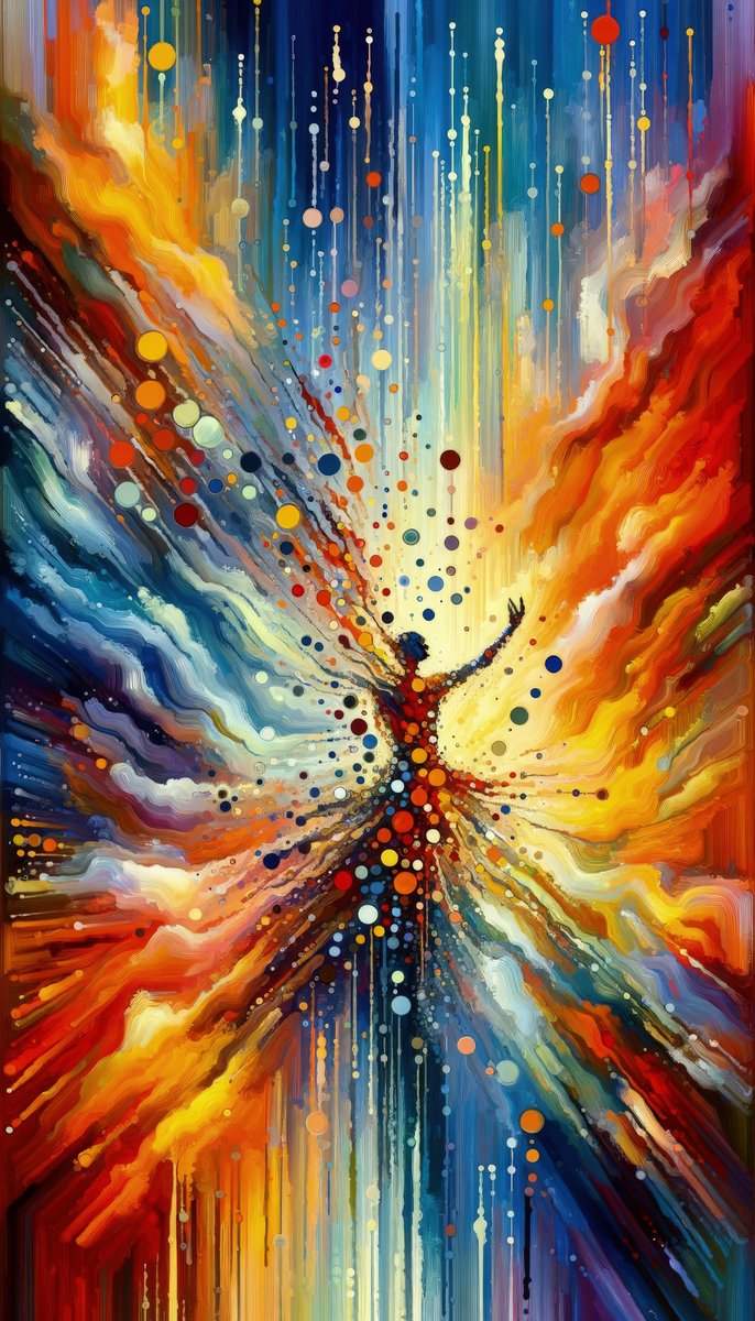 Titled Vibrant Growth Symphony, this vertical image encapsulates the essence of vitality and expansion through its dynamic Tachism style. Bursting from a centralized point, the composition fans out in a kaleidoscope of colors, mirroring the multifaceted nature of growth. Vivid reds and warm oranges to the right evoke the fiery energy of life, while the blues and greens to the left suggest a cooler, nurturing element essential for development. Streaks of white and yellow through the center and extending upwards denote light and direction, alluding to the aiming high that often accompanies growth. Adding to the complexity, a multitude of circular forms proliferate across the canvas. These dots and orbs vary in size and color, creating a visual metaphor for both the diversity and unity inherent in the universal language of growth. Their distribution, with some appearing to rain down while others ascend, hints at the cyclic and perpetual motion of life s continuous progression. The painting evokes a symphonic movement, each streak and dot harmonizing to convey a powerful message—growth is as much an explosion of energy as it is a structured ascent. Absent of any textual elements or borders, the image invites viewers to immerse themselves wholly in this pictorial depiction of development s unbounded essence.