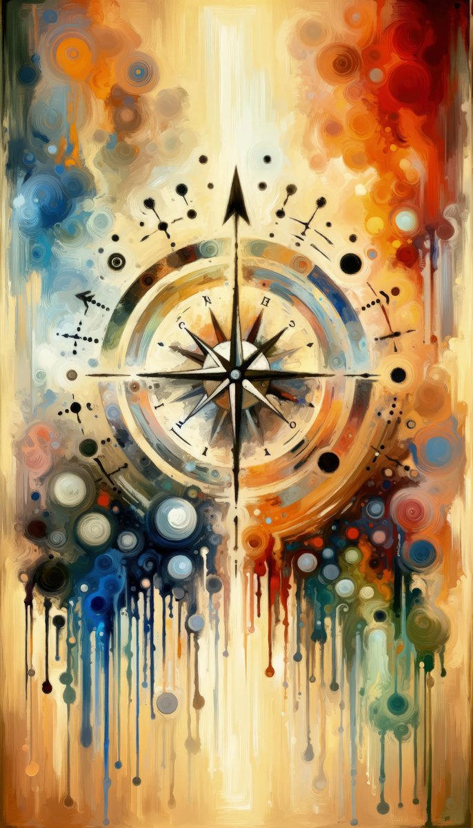 The image titled Guidance Abstract Compass is a vibrant vertical artwork rendered in Tachism style. At its core is a detailed compass, with its needle sharply defined, pointing northward. Its dark silhouette stands in stark contrast to the warmer hue behind it. Surrounding the compass are swirling hues and circular forms that give an impression of both chaos and harmony, suggestive of life s complexities and the directional pull of the inner compass amidst them. Radiating from the compass are splashes and drips of paint, which stretch downward in streaks of blues, oranges, and creams, embodying the fluidity of paint and emotion. This streaking effect evokes a sense of motion and the passage of time, or perhaps the influence of guidance as it permeates through life s journey. The color palette transitions softly from cool to warm, starting with blues and progressing towards orange and creamy yellows, giving the artwork an organic, almost living warmth. Interspersed within this tapestry of colors are smaller compass motifs and various abstract marks, which may symbolize waypoints or decisions points in one s path. Overall, the painting captures the essence of an inner compass through abstract symbols and a blend of chaos and focus, conveying the idea of navigating life s journey with a sense of personal guidance and introspective direction.