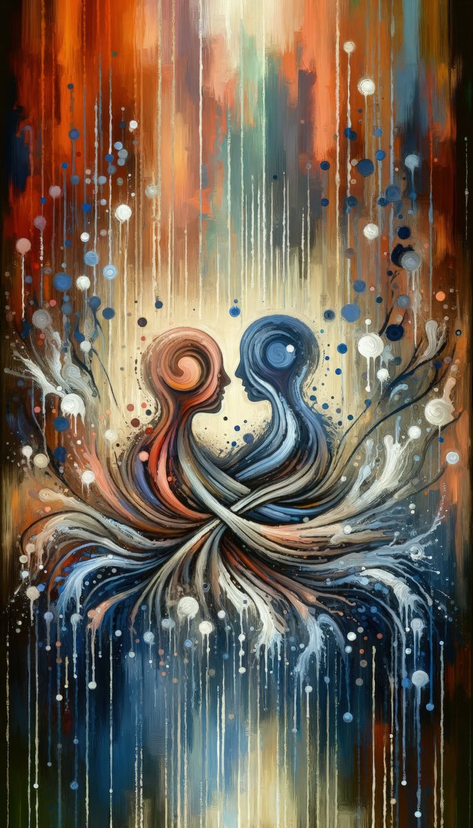 The image titled Empathic Connection Tachism is a striking vertical piece that symbolizes The Empathy Equation through abstract expressionist art, vividly representing emotional connectivity. The tachism style, characterized by spontaneous brushwork, drips, and splatters, creates a dynamic and fluid composition. Central to the artwork, two stylized profiles face each other, their contours merging in an intimate reflection of empathy. These figures, composed of intertwining swirls and lines, appear to emerge from the convergence of various earthy and aquatic hues, suggesting a deep and intrinsic connection between beings. The background is a tapestry of warm autumnal colors, with fiery shades of red, orange, and amber transitioning into cooler notes of blue, teal, and indigo, evoking a sense of balance and unity between opposing forces. Dotted with white and blue accents, the artwork seems to pulse with life, mimicking the ebb and flow of human emotions. The drip effect suggests fluidity and continuity, emphasizing the unwavering nature of empathic bonds that defy the constraints of the painted canvas. Overall, the painting evokes a profound sense of shared experience and mutual understanding, illustrating the essence of empathy through abstract, visual language. The absence of letterboxing or borders allows the viewer to be fully immersed in the depth of the connection depicted, making the image a powerful statement on the human capacity for empathy.