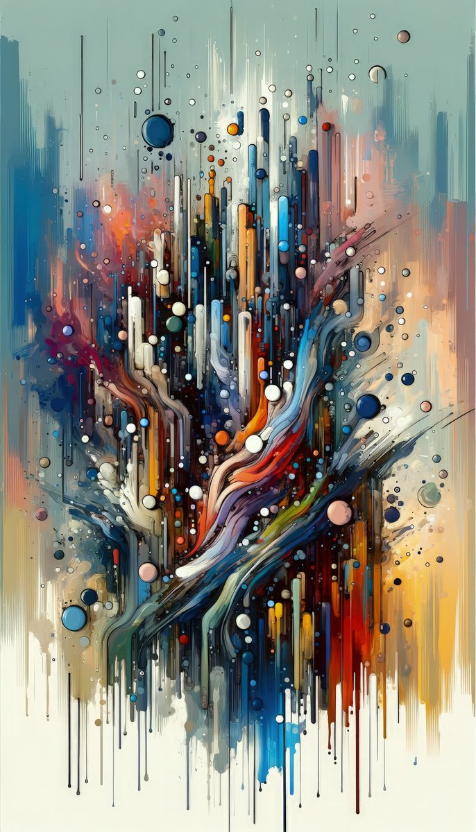 The image titled Coherent Change Visualization presents a vivid interpretation of the concept of dynamic and structured transformation through a Tachism style artwork. It is a vertical image characterized by bold, abstract expressionist elements without any letterboxing or borders. Central to the composition is a chaotic yet harmoniously intertwined cascade of colors and shapes that seem to explode outward and downward from an unseen focal point. Through a medley of energetic strokes and drips, a variety of colors including blues, reds, oranges, and whites intermingle, suggesting an organic sense of growth and evolution. Several elongated elements reminiscent of urban skyscrapers overlap and interact, punctuated by circles and orbs that could represent ideas, people, or components involved in the process of change. These elements range from dense, opaque color spots to more transparent, watery shapes, creating a sense of depth and movement. While specific figures or objects are not discernible, the abstract forms conjure an image of a society or entity in the midst of transformative growth or reorganization, where different aspects and forces are coming together in a coherent and concerted effort. The overall effect is both visually mesmerizing and conceptually evocative, encouraging the viewer to contemplate the nature, complexity, and beauty of change.
