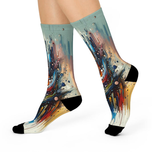 The image titled Coherent Change Visualization presents a vivid interpretation of the concept of dynamic and structured transformation through a Tachism style artwork. It is a vertical image characterized by bold, abstract expressionist elements without any letterboxing or borders. Central to the composition is a chaotic yet harmoniously intertwined cascade of colors and shapes that seem to explode outward and downward from an unseen focal point. Through a medley of energetic strokes and drips, a variety of colors including blues, reds, oranges, and whites intermingle, suggesting an organic sense of growth and evolution. Several elongated elements reminiscent of urban skyscrapers overlap and interact, punctuated by circles and orbs that could represent ideas, people, or components involved in the process of change. These elements range from dense, opaque color spots to more transparent, watery shapes, creating a sense of depth and movement. While specific figures or objects are not discernible, the abstract forms conjure an image of a society or entity in the midst of transformative growth or reorganization, where different aspects and forces are coming together in a coherent and concerted effort. The overall effect is both visually mesmerizing and conceptually evocative, encouraging the viewer to contemplate the nature, complexity, and beauty of change.