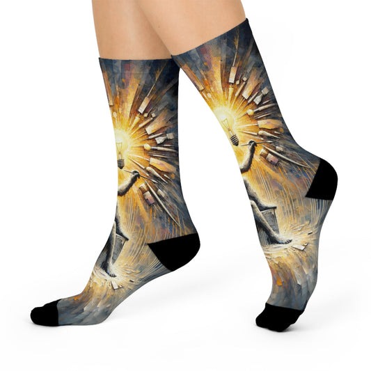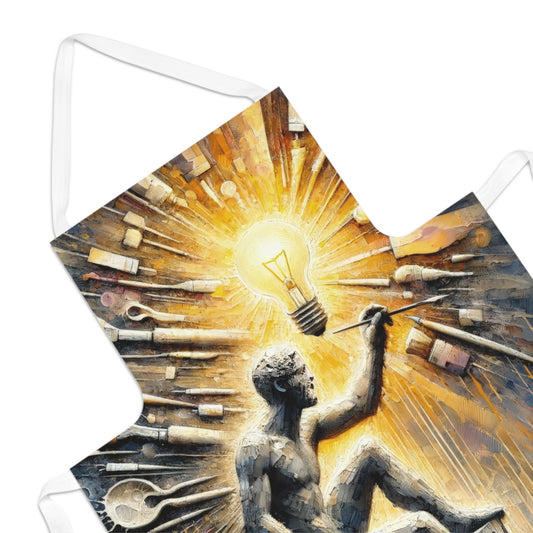 The image titled Idea Sculptor Genesis is a vertically oriented painting rendered in the Tachism style, a method distinguished by its emphasis on the spontaneous and intuitive application of paint, creating a vibrant, abstract appearance. At the center of this rich composition, a radiant light bulb, symbolic of a nascent idea, emanates a powerful burst of light that illuminates the scene and casts an array of elongated shadows. In the foreground, an abstract, sculptural figure resembling an artist or thinker sits thoughtfully, one leg crossed over the other, on a base with an adjacent sculpting tool, which might represent the power of creativity and intellectual labor. The figure reaches out towards the light bulb, signifying a desire to grasp or sculpt the idea into tangible form. Surrounding this central figure, an array of artistic implements such as brushes, sculpting tools, and palette knives radiate out from the light source in a dynamic composition, perhaps illustrating the various tools at the artist s disposal in the creative process. These tools appear to be suspended in the air or being propelled by the energy of the idea itself. The overall effect of the painting is one of dynamism and the generative power of ideas. It encapsulates the process of thoughts and concepts being hewn into practical tools and works of art, visually expressing the transition from intangible inspiration to material creation. The use of exaggerated light and shadow, along with the textural paint strokes, creates a dramatic atmosphere that celebrates the