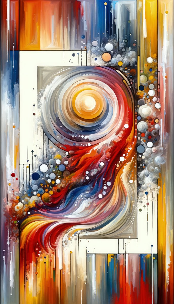 The image titled Harmonic Swirl Elegance is a vertical piece of art in the Tachism style, elegantly designed to represent The HARMONY Framework without the use of text. Warmth radiates from the canvas, where rich swirls of vibrant red, orange, and yellow hues connect with cooler tones of blue and grey, symbolizing a balanced confluence of energy and tranquility. At the center, a circular motif draws the eye, reminiscent of a churning galaxy or a dynamic whirlpool, with layers of colors spiraling inward towards a bright, sun-like core. Around this central vortex, numerous orbs and droplets span outwards in a randomized yet harmonious fashion, imbuing the space with a sense of cosmic order amid chaos. Abstract linear elements and geometric shapes traverse the painting vertically, intersecting with the circular patterns and adding structural depth to the composition. The bold streaks of paint, with varying viscosity and opacity, cascade down the canvas, evoking a passionate release of artistic expression. Each brushstroke and splatter works in concert to embody the harmony of disparate parts joining to form a cohesive whole, a visual symphony of abstract thought and emotion. The painting stands as an artistic interpretation of harmony, masterfully rendered in a symphony of color and form.