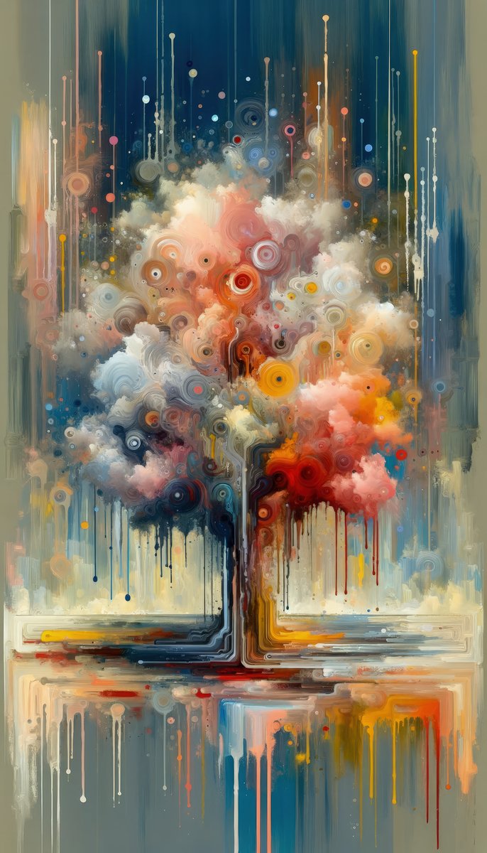 The image titled Abstract Beliefs Reflection is a captivating vertical representation in Tachism style, symbolically portraying the concept of personal beliefs and conditioning. It vividly combines a broad spectrum of colors that seamlessly blend and overlap, creating a dynamic and thought-provoking visual experience. At the center of the composition, an organic structure resembling a tree serves as a focal point, its trunk and branches defined by contrasting shades of black and stark white that emerge from a base of deeper hues. The tree s canopy explodes into a spectacular array of circular patterns and swirls that suggest a blossoming of ideas, principles, and convictions. These patterns are painted in a rich palette of warm shades—crimsons, corals, oranges, and yellows—mingling with cooler tones of blues, grays, and whites, symbolizing the complexity and intertwining nature of one s beliefs. The background features vertical streaks and dots that rain down like streaking comets, possibly indicative of the external influences that impact and shape individual ideologies. Drips of paint cascade down the canvas, further emphasizing the fluidity and evolving nature of personal beliefs. Completing this evocative piece is its reflection at the bottom, creating a mirror image on a calmer surface that perhaps represents introspection and the potential for personal growth and change. This reflection adds depth and symmetry, mirroring the tumultuous yet harmonious dance of belief systems above.