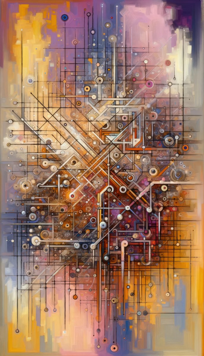 Titled Abstract Structural Complexity, this vertical Tachism style painting showcases a masterful blend of colors and shapes, embodying the idea of Societal Structures and Systems. The canvas is alive with an intricate network of lines, both straight and intersecting, reminiscent of circuitry or a complex schematic diagram. These lines connect an array of geometric shapes and variously sized circles, suggesting connectivity and interaction within a system of considerable detail. The artwork is imbued with a rich palette that graduates through warm and cool hues. Shades of orange, brown, and beige at the bottom rise to meet purples, blues, and pinks toward the top, creating a visually stimulating gradient. Amidst this spectrum, pops of contrasting colors such as bright oranges and deep blues draw the eye and invoke a sense of order within the chaos. The tactility of the painting suggests layers, as if the elements are built upon one another, adding depth and a three-dimensional quality. The varying opacities and the soft blending of colors give the impression of a dynamic backdrop, over which the network sprawls. Overall, the artwork invites contemplation, as it captures the essence of complex societal systems through abstract expression, encouraging the viewer to examine the interdependencies and frameworks that underlie our social fabric.