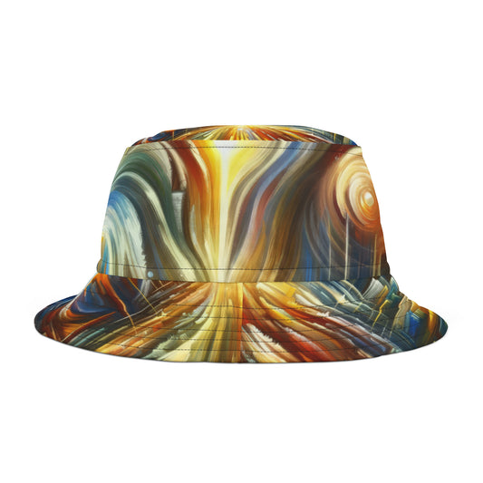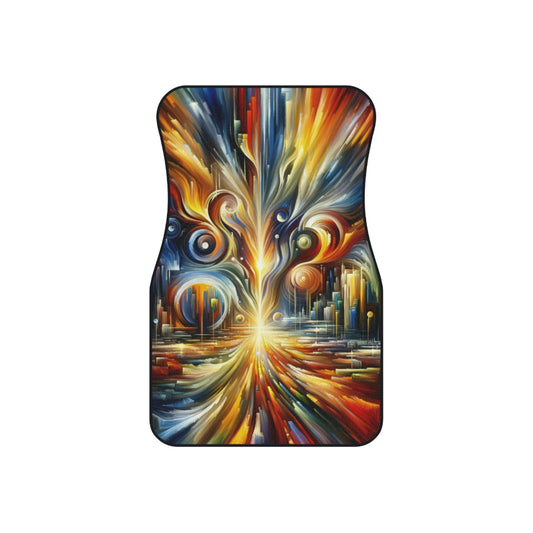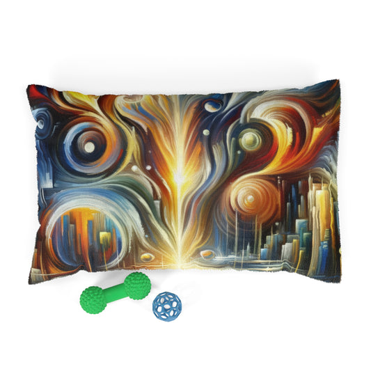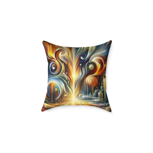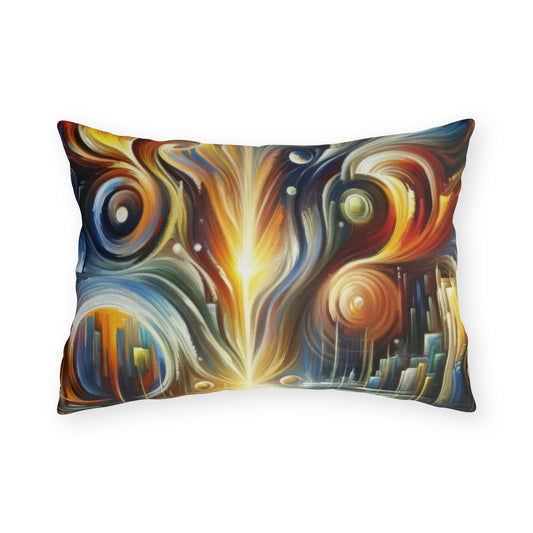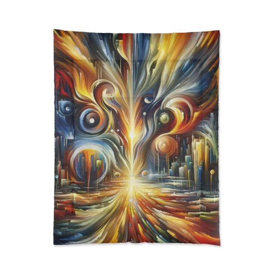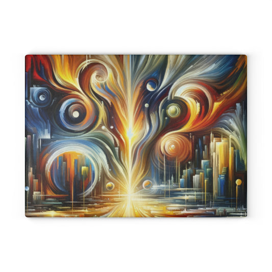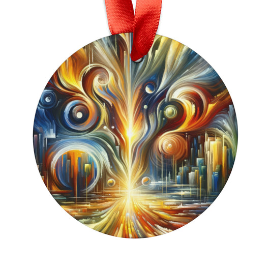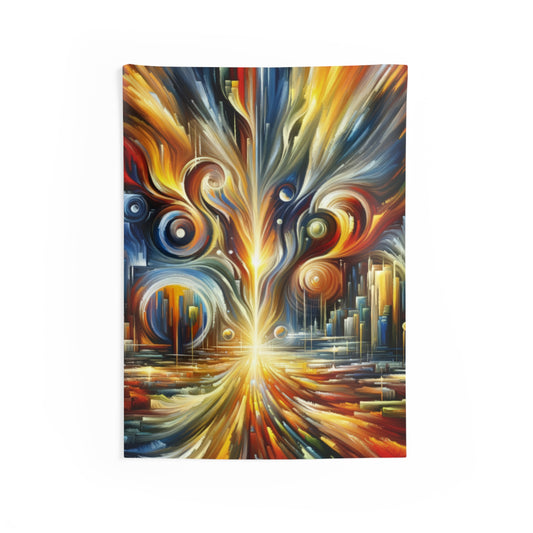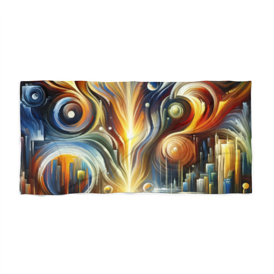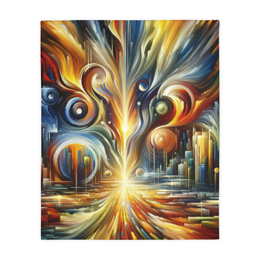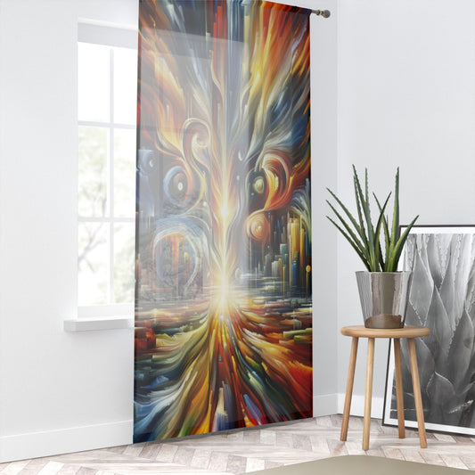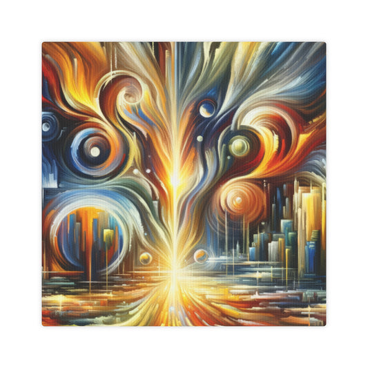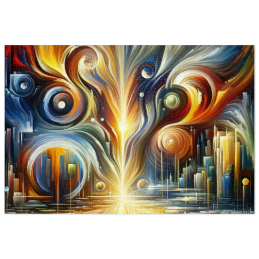 Sovereign Integral Transformation is a dynamic, vertical Tachism style painting bursting with vigorous brush strokes and a vivid color palette. The canvas is alive with a central blazing light that serves as a focal point, radiating outward and illuminating numerous paths in a display that represents the concept of recognition of the Sovereign Integral illuminate paths for global transformation . This artistic piece is a symphony of rich warm colors—fiery oranges, reds, and yellows—interlacing with cool blues and soft whites to create a potent contrast. The expressive, swirling patterns around this light converge towards it, drawing the viewer s eye to the heart of the transformation. It suggests an energetic awakening or enlightenment, with the light seen as a metaphorical beacon of change and wisdom. Around the core, abstract shapes and what appear to be urban structures merge into a harmonious and futuristic stylized cityscape at the bottom of the painting. The city, intersected by the bright paths of light, gives a sense of time and space bending around this transformative power. The artwork emits a sense of urgency and movement. Veiled orbs and concentric circles float within the tumultuous array of brushwork, adding a layer of depth and complexity as if hinting at celestial bodies or atoms in motion—one small part of an interconnected universe responding to the transformative call of the Sovereign Integral.