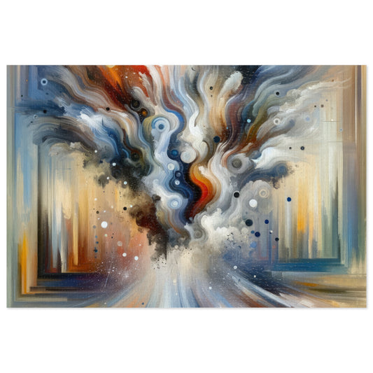 Titled Dynamic External Influence, the image before us is a vibrant vertical Tachism style painting that encapsulates the abstract concept of the Influence of External Forces . This artwork unfolds in a flurry of colors and gestures, conveying motion and emotion through its expressive brushstrokes. At the base of the painting, a convergence of radiating streaks of warm reds, oranges, yellows, and contrasting cool blues suggests a powerful energy source. These colors extend upwards, bleeding into one another and creating a visual symphony that narrates the invisible power of external elements on one s environment or being. As we move our gaze upwards, a chaotic, swirling mix of whites, greys, and darker hues intersects with spots of vibrant oranges and blues. This tumultuous collision mirrors the clash of forces and the resulting disturbances they bring. A sense of movement is palpable, almost as if the painting pulses with life, the energy emanating from the chaos challenging the viewer to interpret its intensity. Dots of various sizes, reminiscent of particles or droplets, sprinkle across the canvas, adding to the sensation of dynamic action and reinforcing the theme of pervasive influence. The effect of the image is both mysterious and compelling, inviting observers to ponder the complexities of forces unseen yet deeply felt.