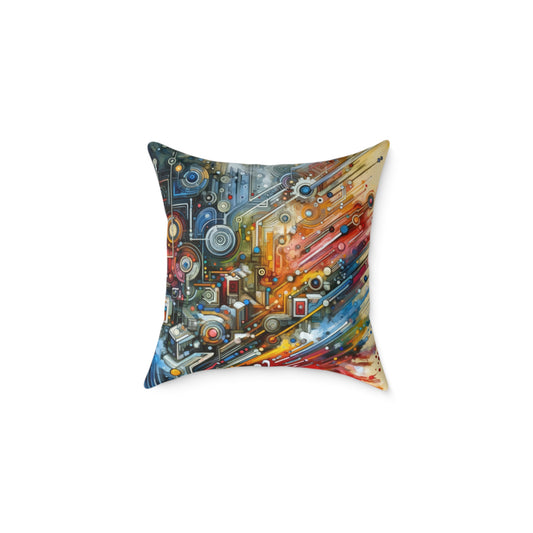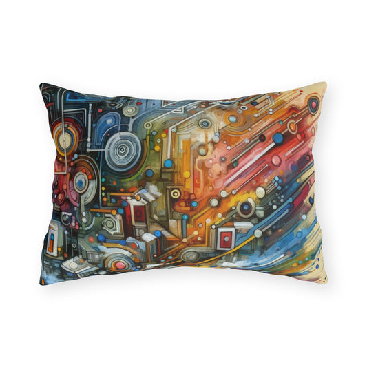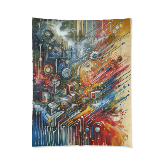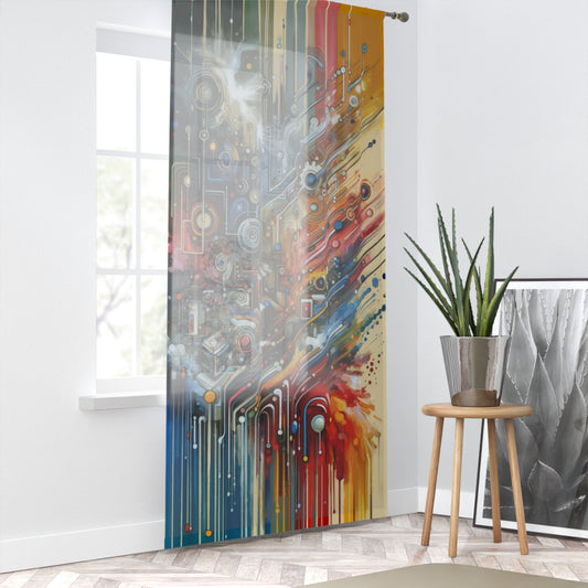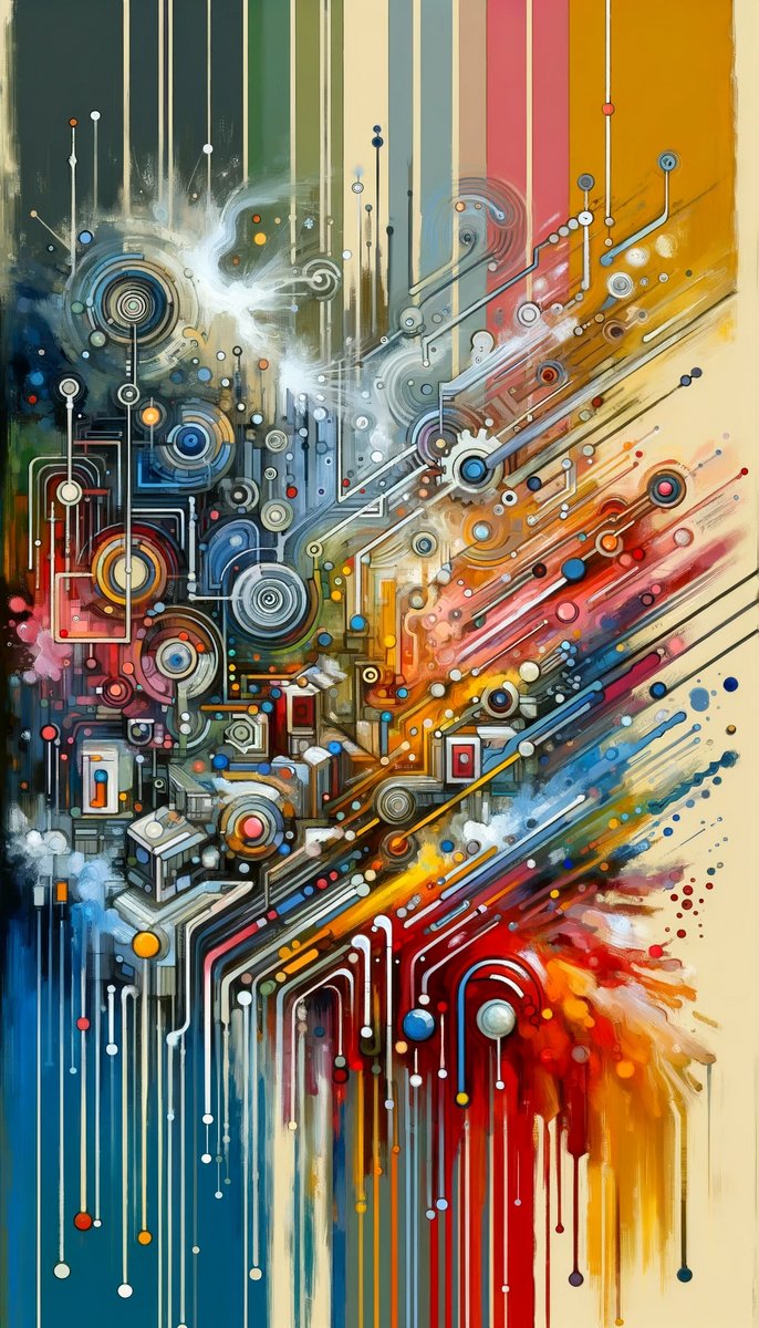 Titled Beliefs Systems Intersection, the vertical image presented is an intricate and dynamic representation of abstract art in the Tachism style. It depicts a symphony of chromatic lines and bursts that intersect, flow, and disperse in a poetic cacophony of colors and shapes. The lines range from thin, delicate strokes to thick drips and streams that seem to defy gravity. The palette is rich and vibrant, encompassing blues, greens, yellows, oranges, reds, and neutrals, each blending harmoniously with the adjacent hues. The array of circles and segments arranged in a seemingly electrical or mechanical pattern add a sense of systematic order amidst the chaos. Geometric elements resembling circuitry and machinery intertwine with more organic forms, symbolizing the complex integration of personal beliefs and societal systems. The way the colors fluctuate between clarity and obscurity may imbue the work with a feeling of the dynamic interplay between individual identity and collective culture. The dripping paint at the bottom speaks to the fluidity and transformation of beliefs over time and under societal pressures, suggesting that what may often seem permanent is, in fact, subject to change. The tactility emphasized by the thick application of paint adds a three-dimensional aspect to the piece, bridging the gap between the visual and the physical realm. Overall, the symbolism is open-ended, inviting viewers to reflect on their convictions and the external forces that shape them.