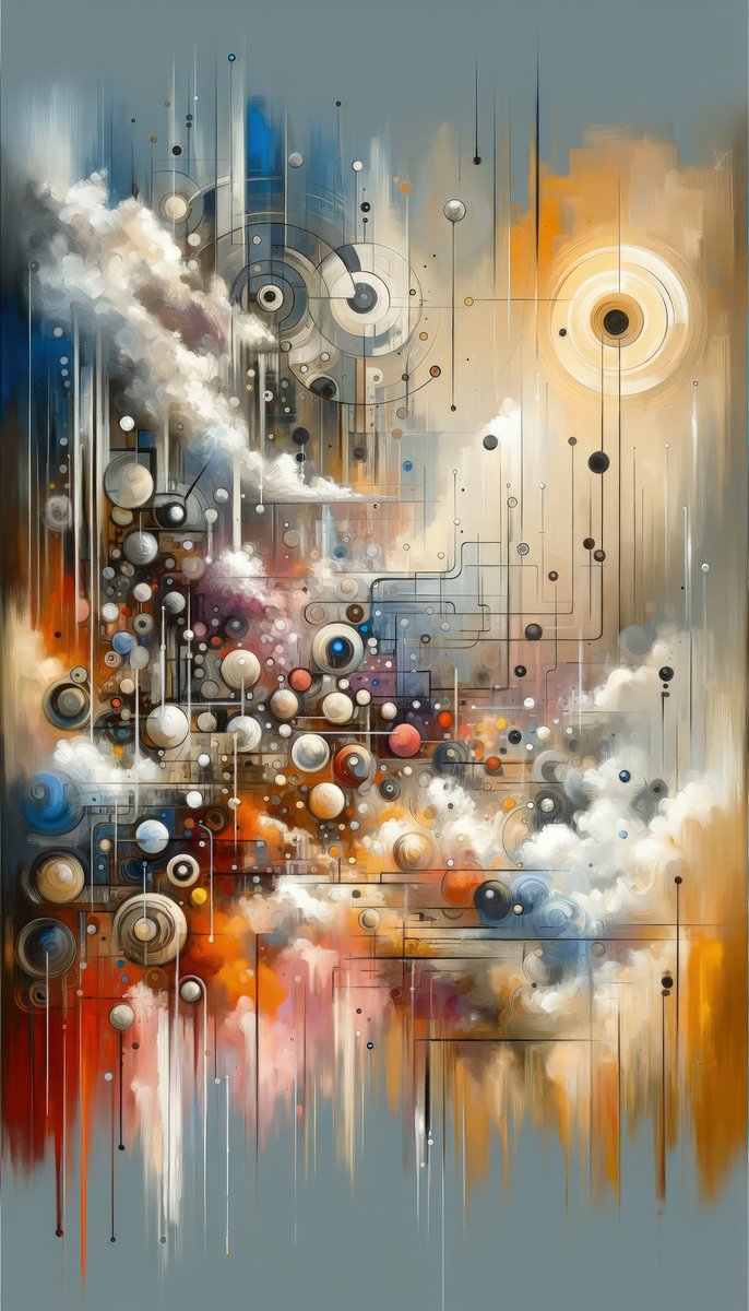 Titled Abstract Mechanical Harmony, this Tachism style painting is a vertical canvas that symbolically represents the concept of Practical Implications. The abstract artwork brings to life the essence of practicality through a harmony of mechanical and organic elements. The painting is characterized by a composition of geometric and amorphous shapes, blending intricately with a dynamic array of colors and textures that suggest a bustling, interconnected system of parts. At the core of the image, interlocking circles and ellipses suggest cogwheels and machinery, evoking the impression of a complex mechanical structure. This machinery is framed by a palette of neutral tones, punctuated by bursts of warm oranges and reds, as well as calming blues and whites, implying a balance between energy and serenity. Lines and dots stream across the canvas like circuitry or perhaps represent pathways of communication between the elements. From certain areas, cloud-like forms billow out, blending the mechanical with the ethereal, and giving the impression of a system in operation. The convergence of varied textures—from smooth, almost metallic surfaces to rough, smoke-like edges—creates a tactile depth that invites the viewer s eye to wander and explore the interaction between chaos and order. The overall effect is one of a controlled explosion of ideas and functions, with each drip, splash, and stroke contributing to a larger picture of systematic coherence, reflecting the practical intricacies of a well-oiled operation.