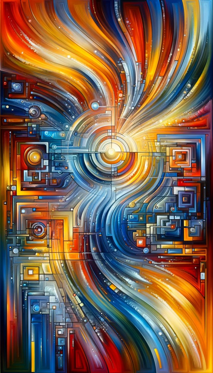 The image titled Digital Tachism Connectivity presents a vibrant and dynamic Tachism style painting. It is an abstraction that visualizes the concept of Conscious Connectivity in the Digital Domain . A symphony of vivid colors flows across the canvas, with streaks of orange, red, blue, and yellow creating a sense of movement that draws the eye inward to the center and outward to the edges in a rhythmic pattern reminiscent of digital waves. Central to the artwork is a radiant, concentric arrangement emanating from what appears to be the core, reminiscent of a sun or a digital signal s source. This focal point seems to represent the onset of connectivity, from which all the digital interactions and data travel outwards. Surrounding the luminous core are intricate, geometric configurations that suggest a complex circuit board or a maze of digital pathways. These structured forms juxtapose the fluidity of the background, creating a harmonious blend of order and chaos that is frequently found within the digital realm. The use of light and shadow adds depth to the piece, with bright highlights suggesting points of data or energy amidst the digital landscape. The painting encapsulates the essence of connectivity in our digital age, symbolizing the intertwined relationship between technology and human consciousness. The abstract nature allows the viewer to derive personal interpretations of the digital life s interconnectedness and complexity.