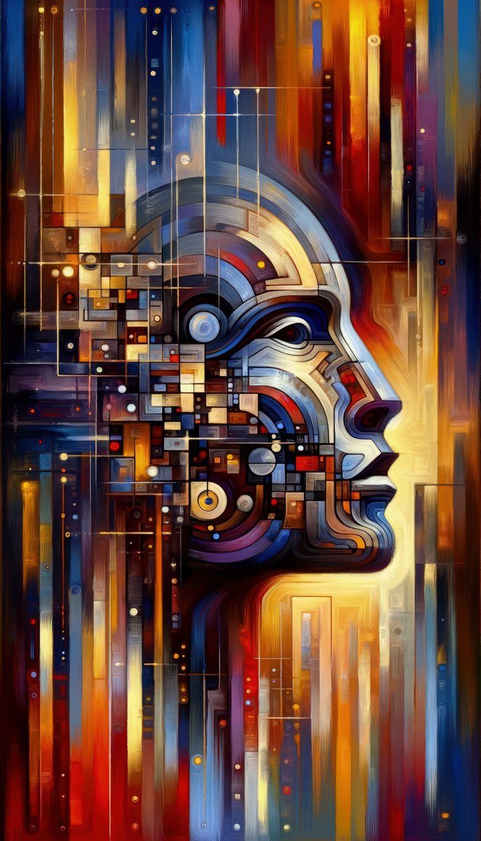 Reflective Tachism Shield is a captivating vertical Tachism style painting that engulfs the viewer in its intense abstraction and vibrant colors. The work is a mosaic of emotions, symbolizing the complex relationship between technology and self-awareness. It strikes a balance between warmth and coolness, with hues ranging from rich blues and purples to fiery reds, oranges, and yellows. At the core of the painting, a human visage is cleverly integrated, appearing to split or mirror itself along the central vertical axis. One half of the face showcases a digital, pixelated motif, composed of numerous squares and rectangles, reminiscent of circuit boards or electronic grids, while the other half is more fluid, with organic lines and circular patterns evoking a more emotional and natural state. Striking contrast is not only thematic but also visual, as the geometric precision on one side opposes the free-flowing curves on the other. This suggests an internal struggle or commentary on the duality of modern existence—the logical, digital self versus the intuitive, organic self. The artwork s title and style imply a commentary on technology as a barrier, possibly reflecting on how screens can act as shields that both protect and isolate us. The use of Tachism, known for its spontaneous and intuitive brushwork, adds a raw and expressive dimension to this philosophical inquiry, indicating a deeper search for identity and authenticity amidst a digitized world. The image is rich in details and symbolism, prompting viewers to ponder