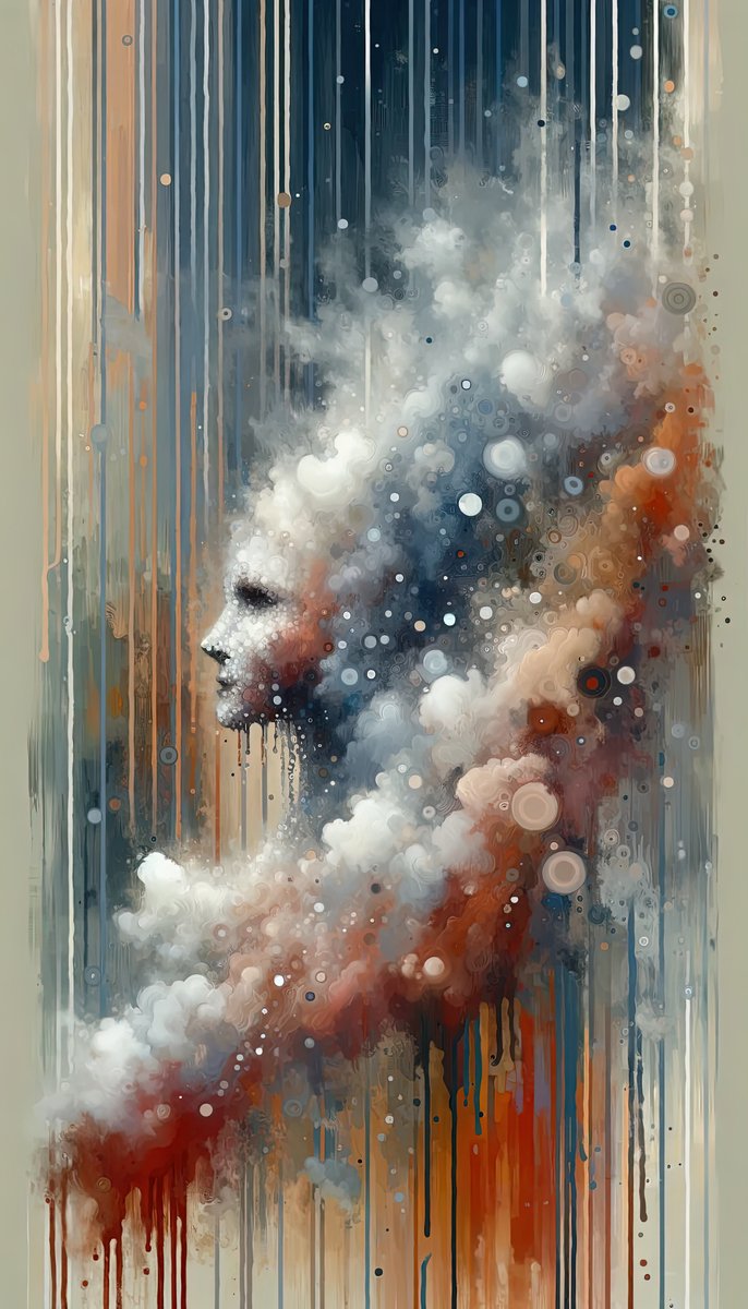 Titled Ephemeral Hour Residue, this vertical image is a striking visual interpretation of time dissolving into thin air, symbolically depicted through a Tachism style painting. The artwork is full of motion, with a seemingly chaotic, yet purposeful arrangement of colors and forms throughout. At the center of the composition, a ghostly, almost ethereal profile of a face emerges from a mist of vibrant hues. The visage appears contemplative, gazing sideways into the unknown. Its form is crafted from soft, swirling patterns of white, blue, and rust, suggesting the fragility and transient nature of existence. The face seems to be dissolving or vaporizing, with its contours dissipating into the surrounding space. The backdrop is a canvas of vertical streaks and drips, utilizing a spectrum ranging from warm amber and copper tones to the coolness of deep blues and grays, which both contrasts with and complements the central figure. The paint appears to be running down the length of the canvas, contributing to the sense of fleeting moments being washed away by the flow of time. Intricate details such as circles, dots, and bursts reminiscent of effervescent bubbles add to the dynamic and ephemeral quality of the piece. These elements seem to dance around the core figure, some trailing off like comet tails, others gathering with intensity near the face. This enigmatic piece invites contemplation on the nature of time and the lingering essence it leaves behind.