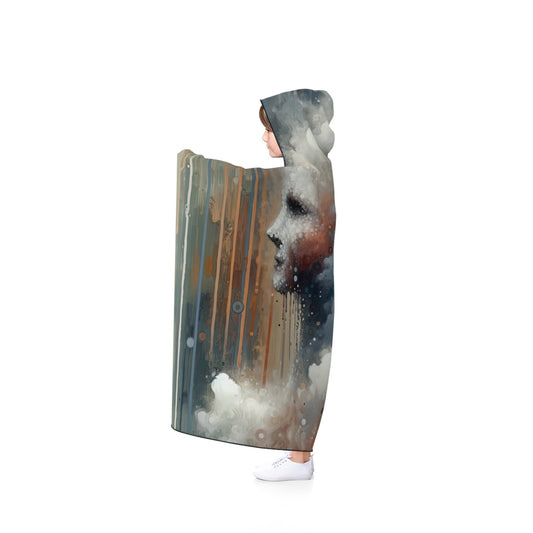 Titled Ephemeral Hour Residue, this vertical image is a striking visual interpretation of time dissolving into thin air, symbolically depicted through a Tachism style painting. The artwork is full of motion, with a seemingly chaotic, yet purposeful arrangement of colors and forms throughout. At the center of the composition, a ghostly, almost ethereal profile of a face emerges from a mist of vibrant hues. The visage appears contemplative, gazing sideways into the unknown. Its form is crafted from soft, swirling patterns of white, blue, and rust, suggesting the fragility and transient nature of existence. The face seems to be dissolving or vaporizing, with its contours dissipating into the surrounding space. The backdrop is a canvas of vertical streaks and drips, utilizing a spectrum ranging from warm amber and copper tones to the coolness of deep blues and grays, which both contrasts with and complements the central figure. The paint appears to be running down the length of the canvas, contributing to the sense of fleeting moments being washed away by the flow of time. Intricate details such as circles, dots, and bursts reminiscent of effervescent bubbles add to the dynamic and ephemeral quality of the piece. These elements seem to dance around the core figure, some trailing off like comet tails, others gathering with intensity near the face. This enigmatic piece invites contemplation on the nature of time and the lingering essence it leaves behind.