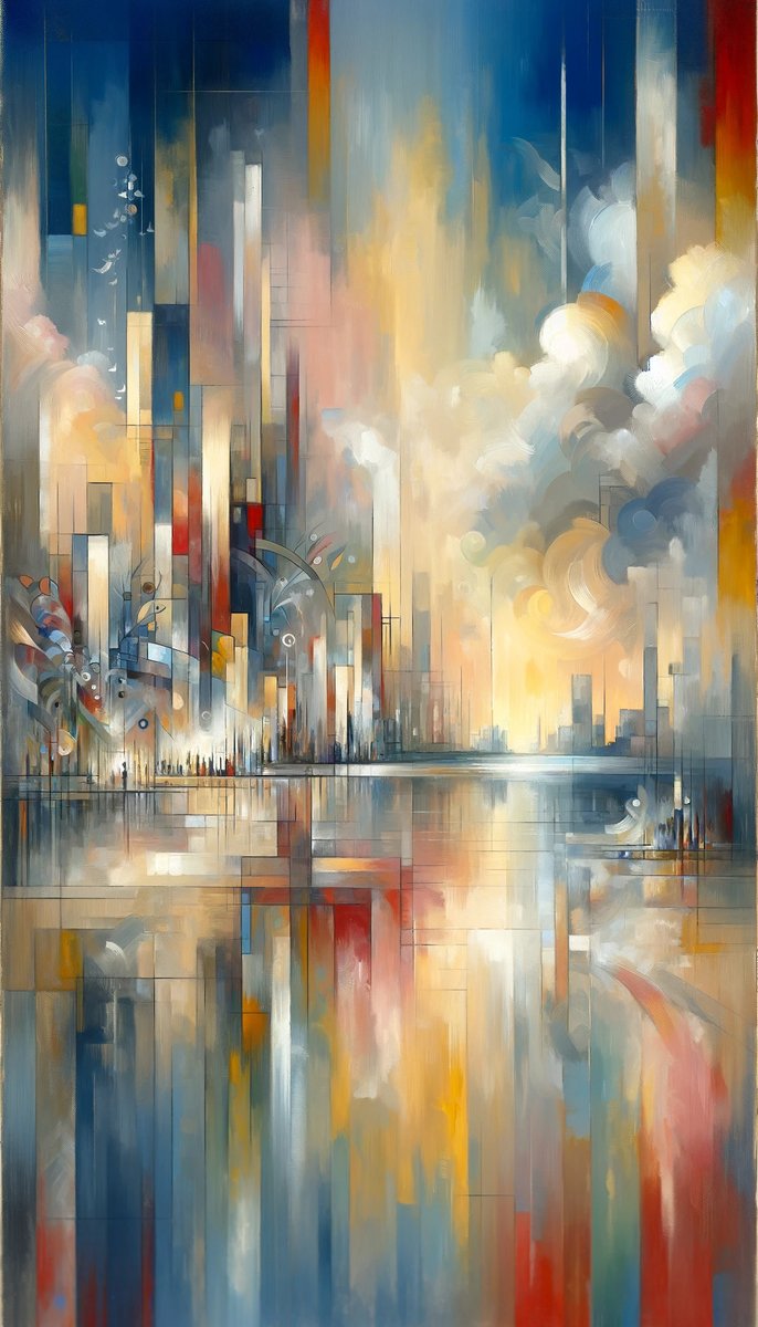 Abstract Buzzing Stillness is a captivating vertical Tachism style painting that explores the duality of an active world s unceasing hum and the elusive tranquility within it. The composition spills over with vivid strokes of color, infusing the canvas with an energy that seems to pulsate through the very fabric of the portrayed scene. Eloquent dashes of red, blue, and gold complement the subtle interplay of light and shadow, suggesting the shimmering reflections of a cityscape. The central motif evokes a metropolitan skyline, where vertical structures stretch towards the sky, painted with both precision and abandon. Towering edifices emerge from the abstraction like watchful guardians over the landscape. In the midst of these architectural forms, whimsical patterns and symbols hint at a hidden narrative, a language of color and form known only to the subconscious mind. Below, the same city is mirrored, creating an almost perfect reflection upon the glassy surface of an expanse that could be an immense body of water. This mirroring doubles the vibrancy and complexity of the colors and shapes above, grounding the buoyant thrum of city life with a serene anchor, alluding to the stillness one might find beneath the surface of the ceaseless commotion. The painting as a whole blossoms into a mesmerizing display of abstract expression, capturing an essence that is both a celebration of vibrancy and a sanctuary of calm—an artistic embodiment of being amidst a world that is ever-buzzing and rarely
