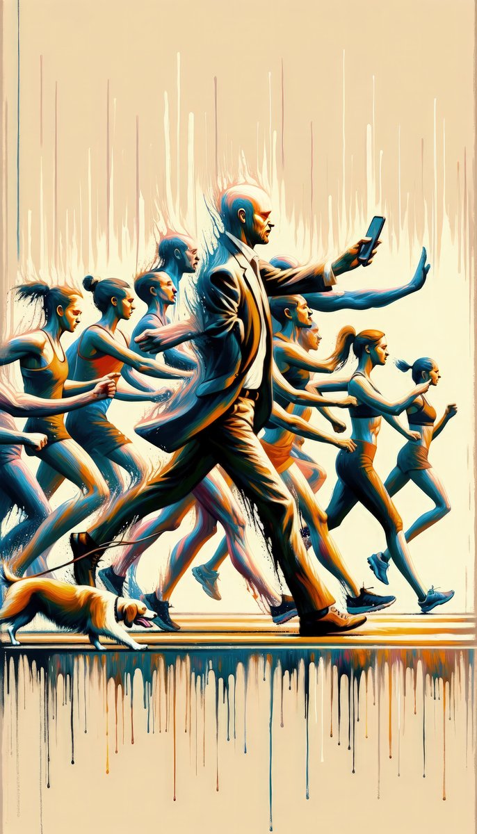 Titled Urban Movement Disconnect, this vertical tachism-style image portrays a bustling scene of city life with a symbolic and dynamic twist. At the forefront, a sharply dressed man in a suit stands out, his attention engrossed in the smartphone he s holding. His detached demeanor contrasts with the fluidity around him, as he seems oblivious to the collective rhythm of his surroundings. Behind him, a succession of joggers blurs into a wave of movement, their athletic forms painted with bold strokes and vibrant hues that capture the essence of motion. Both men and women, their concentrated faces and the vigor in their strides, suggest a communal energy and purpose. Amidst the joggers is a single dog, portrayed mid-stride, tongue lolling in the thrill of the run. The dog s inclusion adds a lighter, more joyous note to the composition, embodying carefree spirit and natural connection absent from the phone-absorbed man. Above and below, the tachism effect intensifies, with streaks and drips of paint emphasizing the verticality of the image and the sense of constant motion. The dripping paint at the bottom creates a reflective quality, as if the scene is momentarily captured above a still surface before the participants move on. This artwork captures the dichotomy of urban life—the ceaseless flow of human activity and the individual isolation that can occur amidst the crowd.