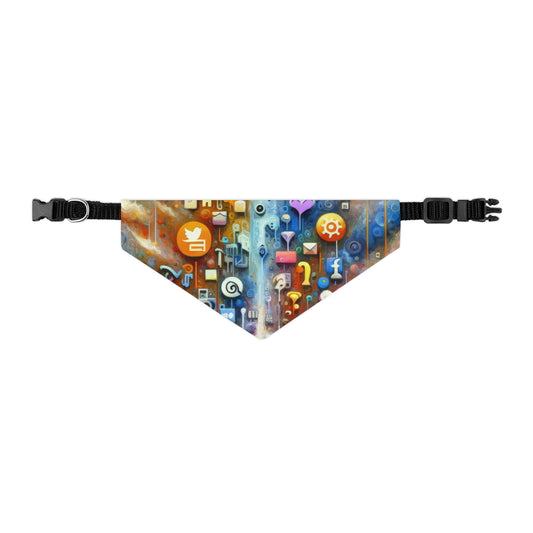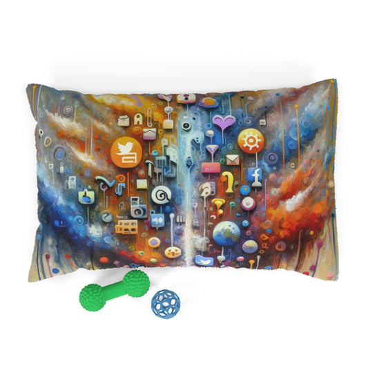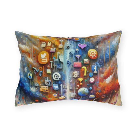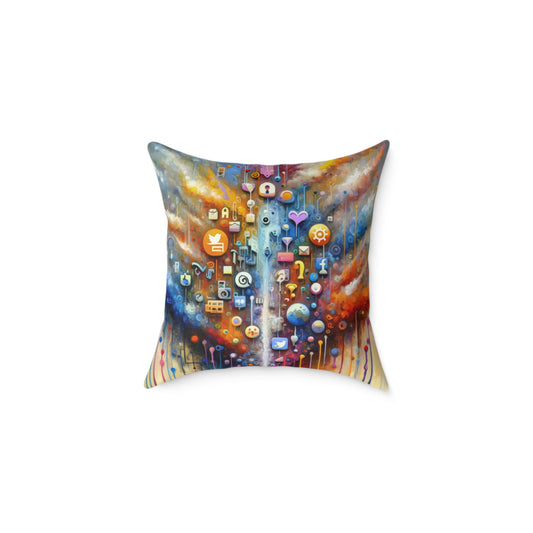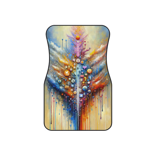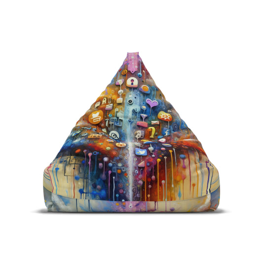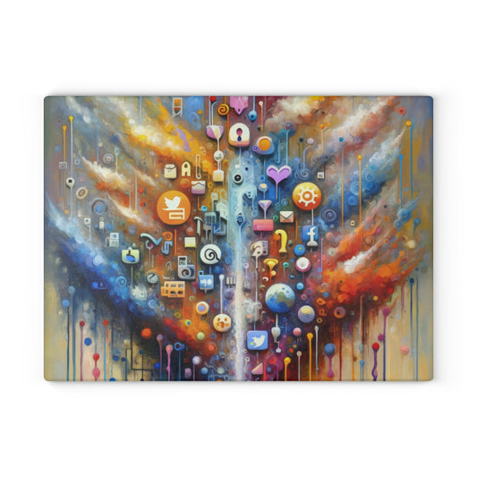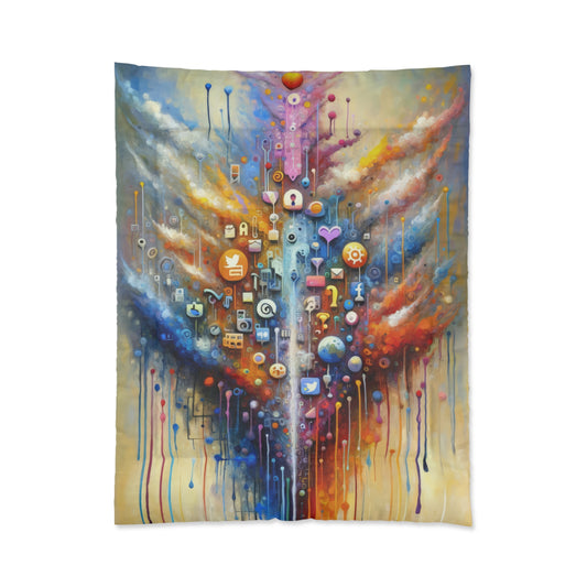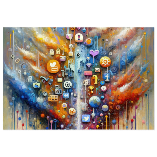 The image titled Digital Essence Revelation is a captivating vertical artwork rendered in the Tachism style, symbolically embodying the concept of digital communication. At its core, the piece explores the idea that interactions through digital mediums such as tweets, posts, and pings are not just ephemeral communications but also pathways to our true selves. Vivid hues of blue, orange, and red merge with softer tones to create a dynamic background that seems to be in a state of flux, suggesting the ongoing nature of digital exchanges. Various familiar symbols and icons associated with social media and modern digital platforms are intricately woven into the visual narrative. These include recognizable logos from platforms like Twitter and Facebook, enveloped and almost engulfed within the abstract expressionist elements, signifying how they are part of the broader dialogue of self-discovery and expression. The composition appears to ascend towards a central orb suggestive of a sun or perhaps an all-seeing eye, representing enlightenment or realization. The dripping effect, with colors streaming down the canvas, adds a sense of motion and connectivity, further emphasizing the continuous flow of information and ideas in the digital age. This piece visually articulates the intertwining of our digital and authentic selves, offering a reflection on how modern communication is reshaping identity.