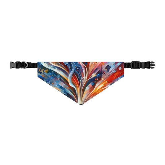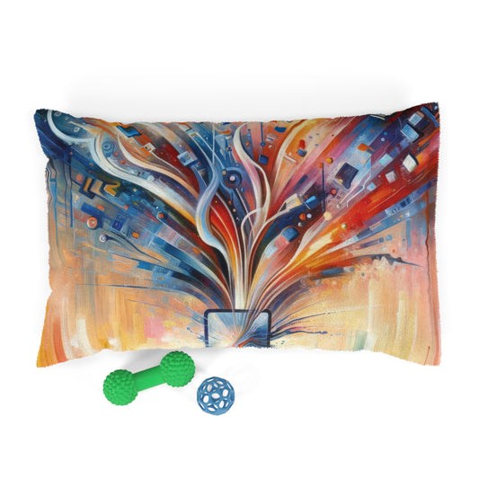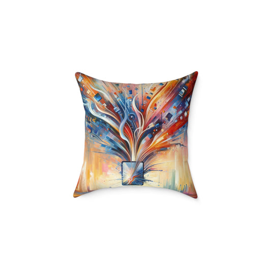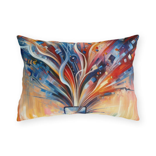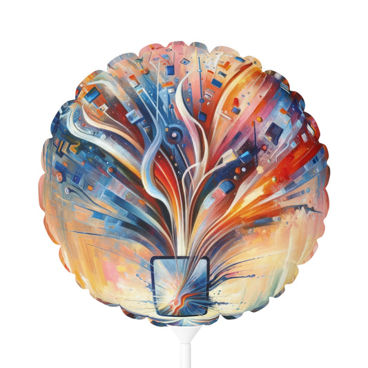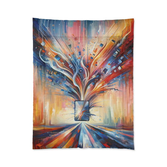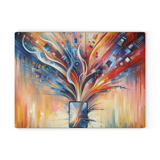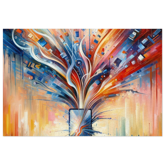 The image titled Empowerment Through Technology is a vivid and dynamic Tachism style painting. At the center of the composition is a stylized representation of technology – an electronic device or a symbolic portal with a screen that bursts forth with an explosion of colors and shapes. From this nucleus, a vibrant array of lines, geometric patterns, and abstract elements radiates outward, suggesting the dissemination of information, energy, and innovation. The color palette is rich and diverse, with fiery oranges and reds blending into cooler blues and indigos at the periphery, possibly denoting the warmth of human touch interfacing with the cold precision of technology. Drips and splatters of paint cascade downwards, hinting at a sense of action and the organic flow of creativity. The overall vertical orientation of the painting adds to the impression of growth and upward movement. This artwork encapsulates the concept of technology as a means of liberation and advancement rather than confinement. It portrays the potential for digital tools to open up possibilities and extend the reach of human capability. The use of abstract expression allows the viewer to interpret the myriad ways in which technology can intersect with human life, fueling progress and empowering individuals.