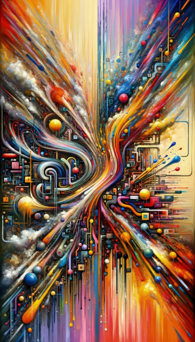Information Bottleneck Cascade is a vibrant and complex image executed in a Tachism style, bursting with kinetic energy and a plethora of details. At first glance, it appears to be an abstract amalgamation of colors and shapes, drawing the eye into a dynamic convergence at the center, which then fans out towards the edges. The palette is rich with warm hues—reds, oranges, and yellows—that blend into cooler tones of blues, purples, and greens, setting up a contrasting visual temperature. What appears to be an explosion of information is symbolically represented by the multitude of circuit-like pathways and streaks of paint that seem to carry bits of data—spheres and cubes—through a dense landscape of digital traffic. Within this flow, larger, more prominent spheres suggest key nodes or pieces of information amidst the stream. The painting captures the feeling of an accelerated transfer of data and the challenge of processing immense volumes of knowledge as they travel through what could be interpreted as a metaphorical neural network or the internet s vast webwork. Despite the frenetic activity, a sense of organized chaos prevails, hinting at the human brain s simultaneous capacity for boundless thought and its limitations in the face of today s relentless information cascade. The energies depicted converge and diverge, creating zones of congestion and release, mimicking the way in which we absorb, filter, and manage the constant barrage of information in the digital age.