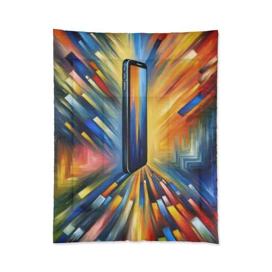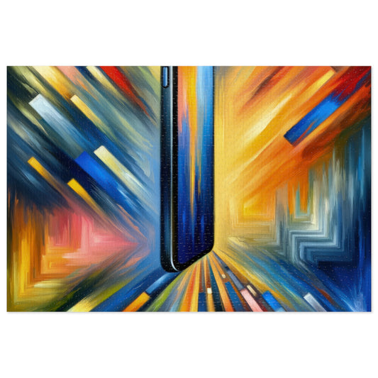 The image titled Connectivity Beacon Dichotomy is a vivid and compelling vertical Tachism style painting that captures the dynamic nature of modern life through the metaphor of a smartphone. Standing as a central figure against a riotous backdrop of colors, the smartphone appears as a sleek, tall beacon, its screen a deep, reflective blue, surrounded by a minimalist black border. From the smartphone burst an array of sharp, angular lines and blocks that streak outward in a kaleidoscopic explosion of color, symbolizing the pervasive reach of connectivity in the digital age. The lines radiate with a sense of urgent energy and motion, suggesting an almost uncontainable force emanating from the device. Bright yellows, deep reds, and a spectrum of blues collide and contrast, creating a sense of harmony and tension simultaneously. This vibrant clash of colors and shapes poignantly illustrates the dichotomy of the smartphone as a symbol of connection that can sometimes lead to social fragmentation and isolation. The painting s dynamic composition, with its converging and diverging lines, reflects the complex and multi-faceted nature of digital communication. It conveys a world that is ever more interconnected while also highlighting the stark difference between physical and digital interaction, inviting contemplation on the role technology plays in human relationships.