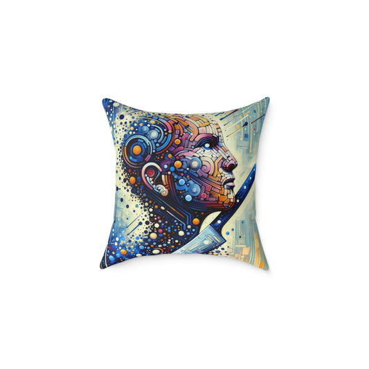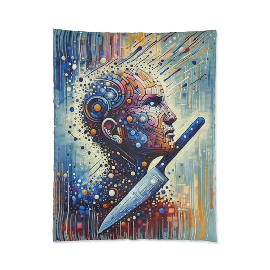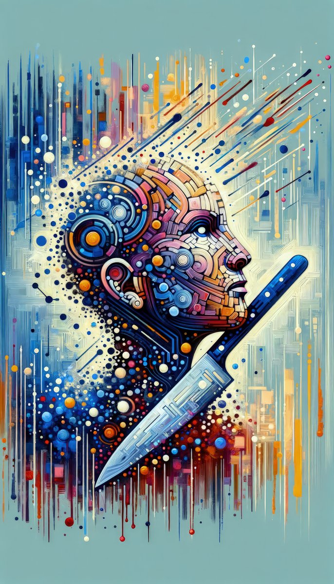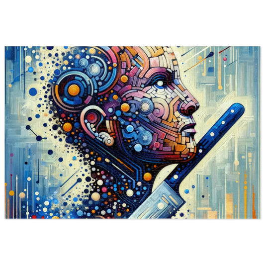 The image titled Digital Carving Abstract presents a vibrant and dynamic composition in a vertical format that exhibits characteristics common to Tachism, an abstract art movement focused on the spontaneous and intuitive application of paint. The central motif is a mechanical, humanoid profile that appears as if being intricately carved from the surrounding digital ether by a large, prominent chisel at the base, suggesting the concept of skillfully shaping meaningful spaces within the complex digital landscape. This humanoid profile features a rich assemblage of gears, circuits, and mechanical components that seamlessly blend into the abstract expressionistic background, characterized by dripping lines of paint, a chorus of dots, and energetic strokes that create a sense of controlled chaos. The palette is an electric symphony of blues, oranges, and pinks, with splashes of white and sporadic hints of other colors, imbuing the artwork with visual depth and a futuristic aesthetic. The contrast between the sharp lines of the chisel and the curvilinear forms of the mechanical face highlights the idea of creation and craftsmanship within the realm of the digital expanse. The artwork captures a moment where this artificial visage emerges from the abstract, a visual metaphor for the intersection of technology, art, and human imagination.