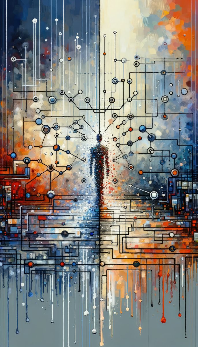 The image entitled Technological Connectivity Bridge is a vertical painting done in a Tachism style, symbolically encapsulating the theme of Technology as a Bridge, Not a Barrier. This vibrant artwork effectively merges abstract expressionism with digital motifs to convey the idea of integration between technology and human interaction, where technological advancements serve as a means of connection rather than division. At the center of the piece is a striking, vertical array of pixels that appear to disintegrate and scatter, reminiscent of a digital signal or perhaps a waterfall of data, suggesting a continuous flow of information. This central element acts as a bridge connecting the top and bottom halves of the canvas, symbolizing how technology links various aspects of life and society. The surrounding area is a complex network of interconnected lines and nodes that resemble circuitry or a schematic, indicating an intricate system of technological links. The top portion of the artwork is washed in cooler tones, possibly representing the digital or virtual world, while the bottom gradually transforms into warmer hues, perhaps hinting at the physical or human realm. Droplets of paint in various colors rain down from the circuits, much like the dripping technique seen in abstract expressionist paintings, lending the work a dynamic and organic feel that counterbalances the structured elements of the composition. Overall, the thoughtful juxtaposition of digital symbols with a free-flowing, painterly approach makes this image a compelling visual metaphor for the unifying potential of technology in modern society.