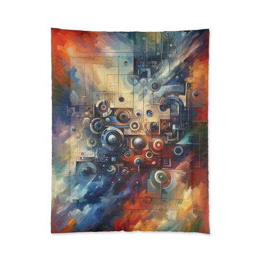 Tech Gratitude Fusion is a compelling vertical Tachism style painting, brimming with abstract expression and vibrant colors. The artwork evokes the sense of gratitude and generosity through the lens of technology. Central to the piece are mechanical and geometric configurations, reminiscent of intricate circuitry or machinery. These elements are infused with warmer tones at the base, gradually transitioning to cooler hues towards the top, symbolizing perhaps a spectrum of human emotions intertwined with the digital age. Curves intersecting with straight lines, spheres, and concentric circles dominate the scene, sparling in a sort of organized chaos that suggests complexity and connectivity. Some shapes are detailed with what appear to be screws or rivets, reinforcing the technical theme. The painting masterfully integrates the stark, precise nature of technology with the free-flowing, dynamic strokes typical of Tachism, an art movement focused on the tactile aspect of painting. This convergence is achieved with bursts of colors, from deep oranges and reds to blues and creams, each brushstroke contributing to an overall sense of movement and harmonious complexity. Highlighted areas and shadows give the image depth, making the technological components pop out of the canvas against the abstract background, as if signifying the emergence of gratitude and giving from within the digital realm.