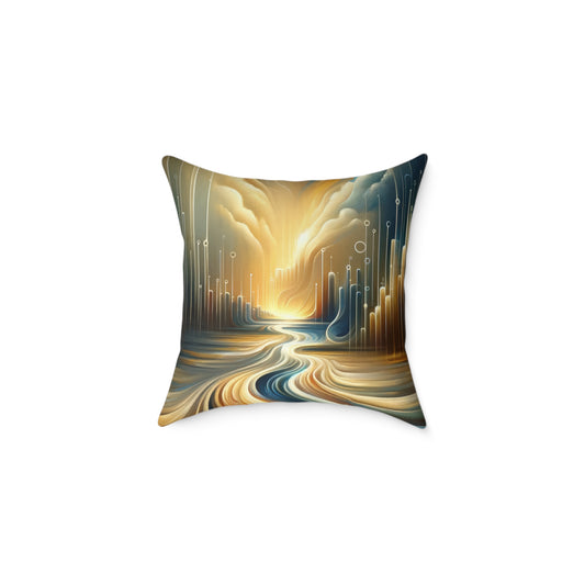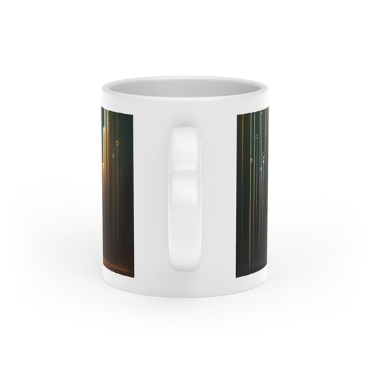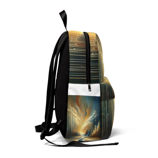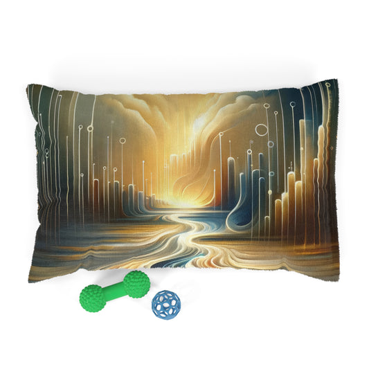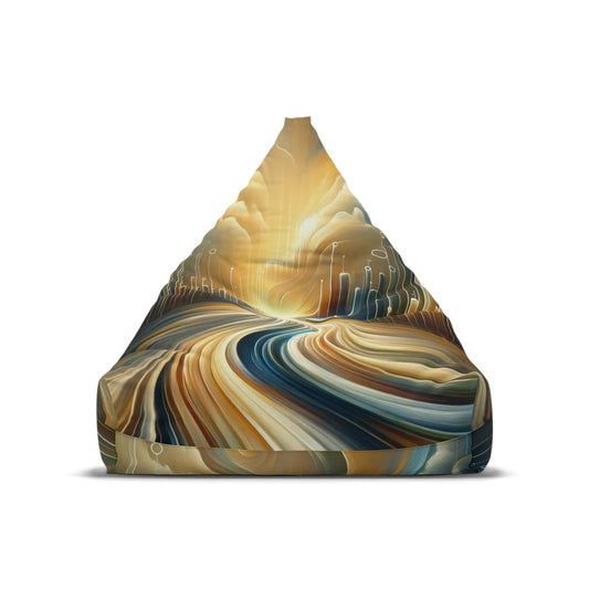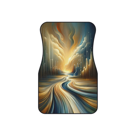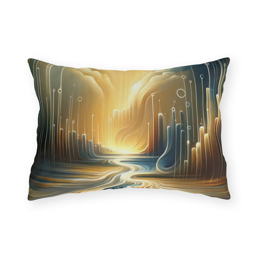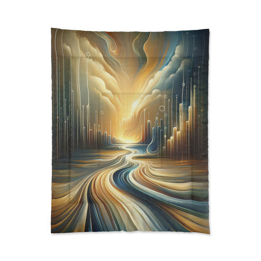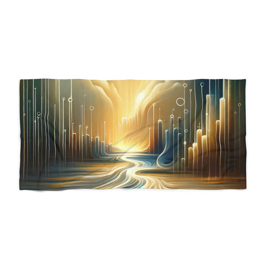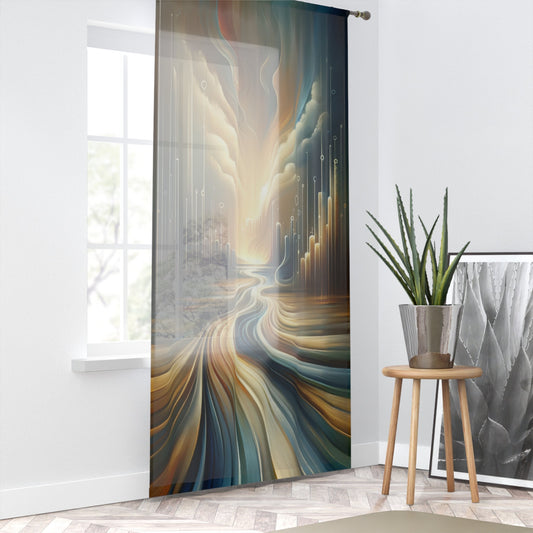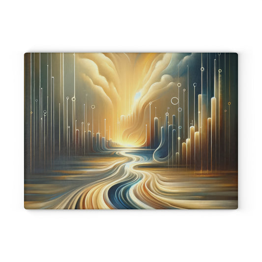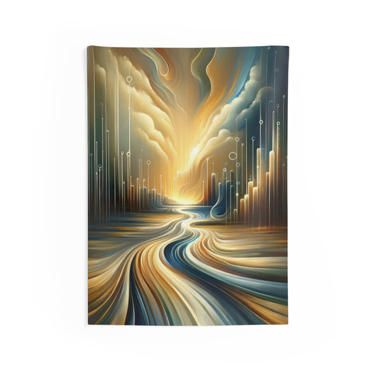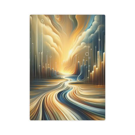 Titled Frequency Shift Evocative, this vertical Tachism style painting symbolically represents the notion that enabling a frequency shift doesn t necessitate monumental leaps but can begin with subtle, everyday actions. The artwork exudes a dynamic sense of motion through its flowing, wavelike forms in the foreground that seamlessly transition into towering structures and celestial formations in the background. Vibrant hues of gold, blue, and amber swirl together, creating an almost otherworldly landscape dominated by rhythm and energy. Thin, white lines resembling bars of light, or perhaps data, stream downwards from the sky, suggesting a connection between the heavens and earth, reinforcing the theme of frequency and resonance. In the center, the light seems to emanate from a distant, undefined source, contributing to the painting s central idea of a pivot or change in energy levels. The clouds depicted have a majestic and ethereal quality with their soft, billowing shapes, contrasting with the more linear and precise elements that represent the frequencies. Each brush stroke in the piece adds to a sense of organized chaos, capturing the complexity of initiating even the smallest shifts in one s vibrational state. Overall, the painting encapsulates a blend of abstraction and symbolism, inviting viewers to consider the subtle, intrinsic changes that can lead to profound transformations.