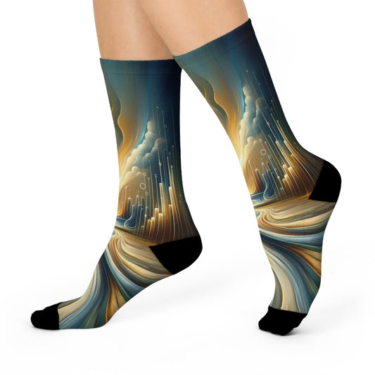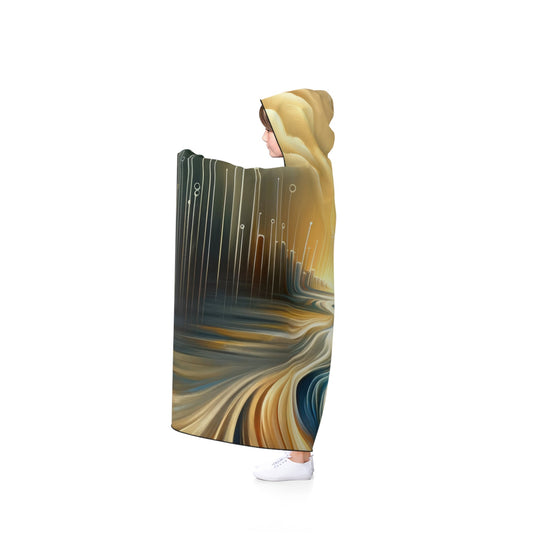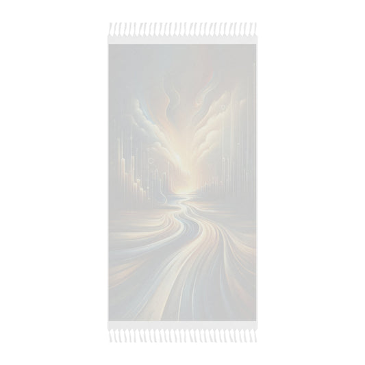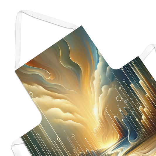 Titled Frequency Shift Evocative, this vertical Tachism style painting symbolically represents the notion that enabling a frequency shift doesn t necessitate monumental leaps but can begin with subtle, everyday actions. The artwork exudes a dynamic sense of motion through its flowing, wavelike forms in the foreground that seamlessly transition into towering structures and celestial formations in the background. Vibrant hues of gold, blue, and amber swirl together, creating an almost otherworldly landscape dominated by rhythm and energy. Thin, white lines resembling bars of light, or perhaps data, stream downwards from the sky, suggesting a connection between the heavens and earth, reinforcing the theme of frequency and resonance. In the center, the light seems to emanate from a distant, undefined source, contributing to the painting s central idea of a pivot or change in energy levels. The clouds depicted have a majestic and ethereal quality with their soft, billowing shapes, contrasting with the more linear and precise elements that represent the frequencies. Each brush stroke in the piece adds to a sense of organized chaos, capturing the complexity of initiating even the smallest shifts in one s vibrational state. Overall, the painting encapsulates a blend of abstraction and symbolism, inviting viewers to consider the subtle, intrinsic changes that can lead to profound transformations.