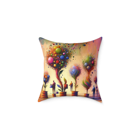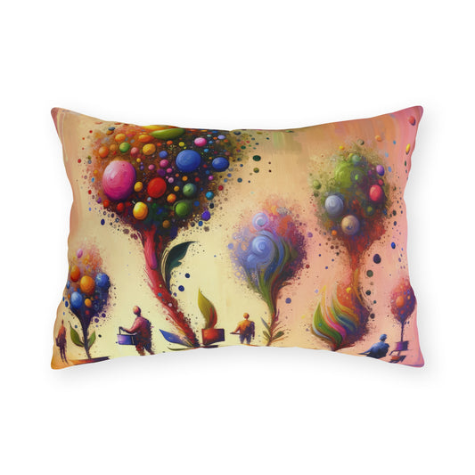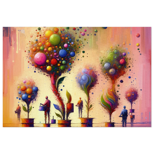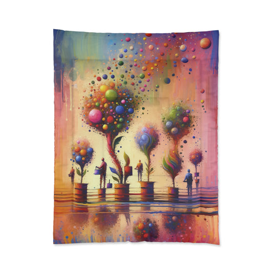 Titled Vibrant Digital Arboriculture, the image is a stunning vertical composition that masterfully employs the Tachism style to symbolize the concept of The Virtual Garden: Tending to Your Online Environment. It depicts an array of vivid colors and dynamic brushstrokes that create a lively and immersive scene. The focal point of the artwork is a series of whimsically abstract trees, each unique in its swirling patterns and bursting with a spectrum of spherical elements that resemble vibrant fruits or flowers. These elements are in various sizes, suspended mid-air, and their colors range from warm yellows, passionate reds, and cool blues to serene greens and purples. The trees seem to grow out of rectangular, pot-like platforms. Amongst this digital flora, silhouetted figures of individuals can be seen, each engaging with the environment in a different manner. They appear to be nurturing or interacting with these enigmatic arboreal structures, perhaps a metaphor for cultivating one s digital space. The reflections on the glossy surface beneath the figures and trees add a layer of depth, reinforcing the ethereal quality of the image. The background is a canvas of harmonic yet contrasting shades of blues, pinks, and oranges, with vertical streaks that may represent rain or the streaming of data. Overall, the piece exudes an atmosphere that is both serene and spirited, inviting contemplation on the beauty and complexity of our online landscapes.
