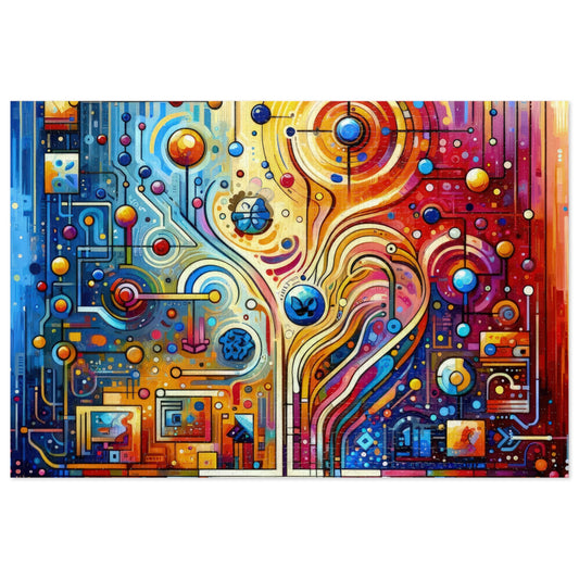 Titled Supportive Divided Empathy, this vibrant vertical image is an abstraction in the Tachism style that symbolically illustrates the concept of a circuit of support in the context of digital empathy. The artwork is a kaleidoscope of vivid colors and dynamic shapes, which suggests interconnectivity and resonates with the theme of empathy in the digital realm. At the heart of the composition lies a series of intricate patterns and lines that converge to create a bilateral symmetry, reminiscent of the outline of a human brain or a circuit board, blending the organic with the technological. Radiating outwards from this central motif are curved lines and swirls, giving the impression of energy pulses or the flow of information. Circles and orbs of varying sizes dot the painting, some connected by lines, others floating independently, symbolizing nodes and connection points within a network. The entire image is replete with intense blues, oranges, yellows, and reds that both juxtapose and complement each other, creating a harmonious yet energetic feel. This deliberate use of color underscores the artwork s communicative intent, much like the nuanced expression of empathy in a digital conversation. The mirror-like reflection at the lower part of the image adds a sense of depth, making it appear as if the intricate network of support and empathy extends beyond the visible surface. This adds another layer to the theme, suggesting the profound impact of empathy and support reaching into unseen depths. Overall, the painting captures the essence of connections and the emotional inter