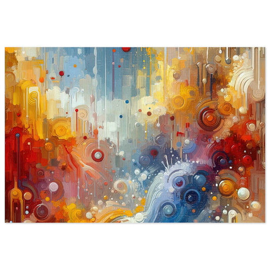 The image titled Joyous Effortless Exhale is a vertical canvas exuding a vibrant array of colors and dynamic abstract shapes, characteristic of the Tachism art style. Dominant hues of blue, orange, red, and white merge with subtle nuances of yellow, creating an atmospheric backdrop reminiscent of a sky painted with the warm glow of sunrise or the cool calm of dusk. Drips of paint cascade down the canvas, their fluidity imparting a sense of motion and freedom as if they are gently flowing from an unseen source above. These variegated streams hold within them a multitude of circles and dots of varying sizes that punctuate the composition like bubbles or celestial bodies. Some of these circles appear as if they were complete whirls of paint, while others seem like residue from the path of a paint-filled brush twirling through space. This abstract expression invokes the theme of shared joy—a feeling as natural and essential as breathing. The artwork is devoid of any rigid frames or letterboxing, allowing its essence to spill beyond the boundaries of conventional containment. The image radiates warmth, vitality, and a liberating sense of exhalation, inviting the viewer to partake in the universal and wordless emotion it so effortlessly conveys.