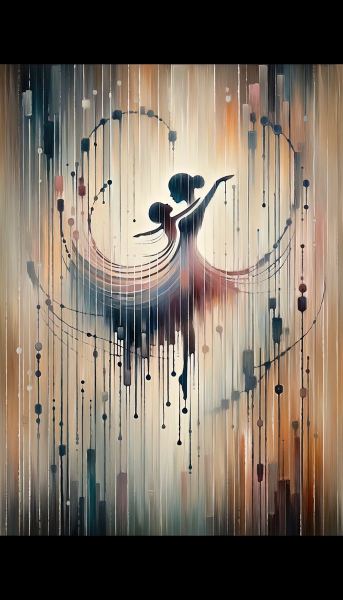 The image titled Rhythmic Heart Dance is a striking vertical artwork that exudes a sense of movement and emotion through its abstract Tachism style. Displaying a harmonious blend of warm and cool tones, the piece uses a muted palette primarily consisting of earthy browns, beiges, and subtle hints of faded reds and blues that evoke a serene yet dynamic atmosphere. At the heart of the composition is the graceful silhouette of a figure, which appears to be in a poised dance stance, with one arm extended upwards as if reaching for the ethereal melody that propels their movement. There is an impression of another figure that closely interacts with the central silhouette, suggesting an intimate and silent dance, a duet of figures connected by unspoken synergy. Drips and vertical streaks run down the length of the canvas, creating a rain-like effect that adds to the sense of rhythm and flow within the image. These drips also resemble strings of beads or notes on a staff, reinforcing the musical motif which is central to the artwork s theme. Interplaying with the fluidity of the figures and the background are geometric shapes reminiscent of heartbeats on an electrocardiogram, underscoring the heart aspect of the title. The image is imbued with a sense of time suspended, capturing a solitary moment where the heartbeat and the silent dance are one, symbolizing a deeper connection and emotional resonance that transcends words.