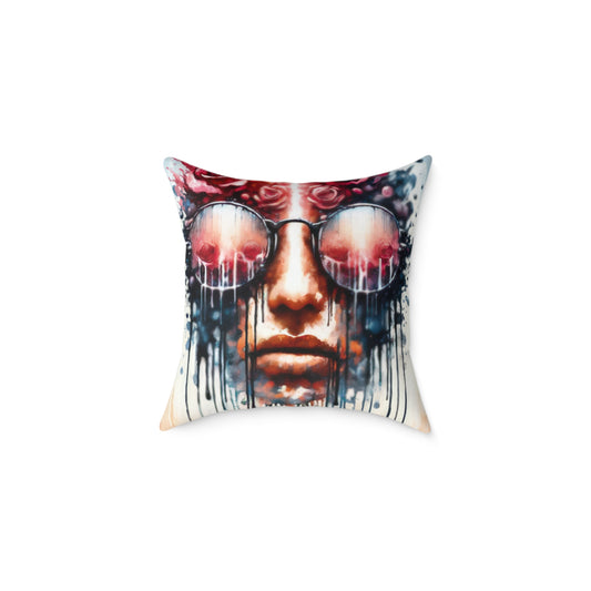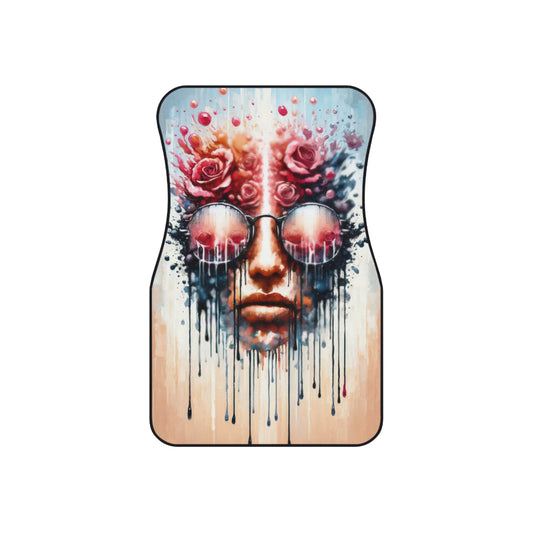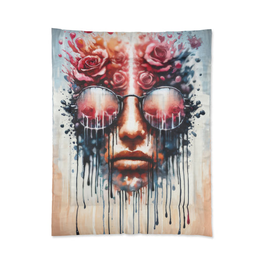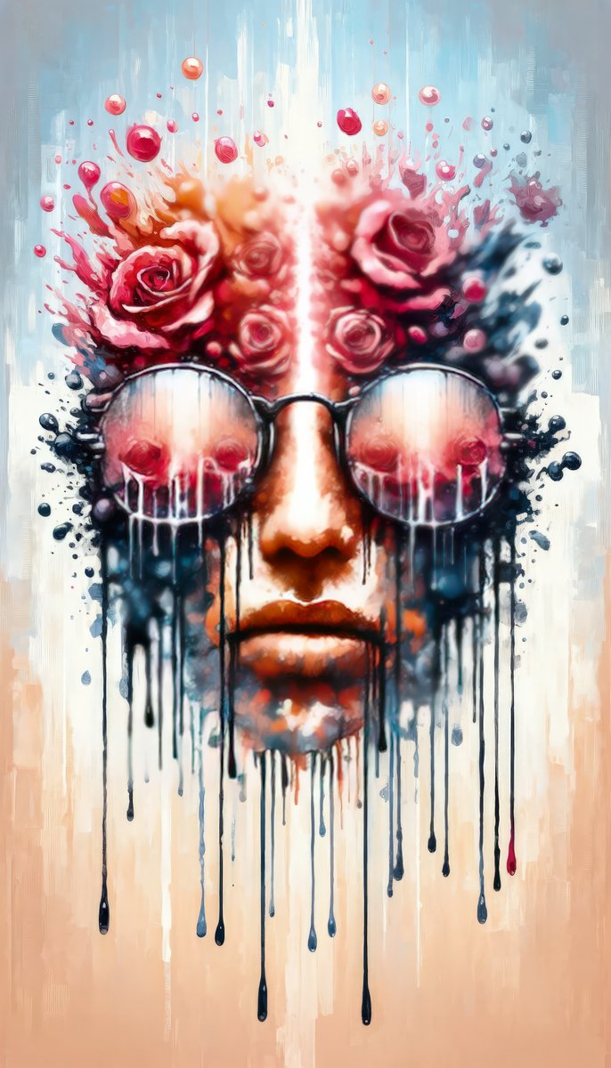 The artwork titled Perception Cleansing Tachism is a vertical image that resonates with vivid emotion and a profound message. The central subject is a portrait head-on, predominantly featuring a face that appears inwardly reflective. Across the forehead and the crown, an explosion of vibrant reds and softer pinks creates a dynamic and textured effect, reminiscent of blooming roses and scattered pearls, mingling in a dance of colors. Upon the subject s face are a pair of glasses, and notably, the lenses are awash with splashes of red, suggesting a symbolic act of cleaning or removing colored perceptions. The drips from the glasses create an evocative contrast with the intense hues above, flowing down in deep blues and blacks, drawing the eye to the allure and gravity of the cleansing process. The backdrop, a plain canvas of soft, creamy tones, serves as a calm counterbalance to the intense emotional spectacle at the forefront. It provides a stage where the spectacle of cleansing one s perception can fully unfold, stark in the contrast it offers to the visceral array of colors dripping from the glasses. The image, painted in the Tachism style, carries with it the raw and subjective expression of the artist s vision, emphasizing the idea that cleansing our lens of perception might offer a more genuine view of reality than the one distorted by rose-tinted glasses.