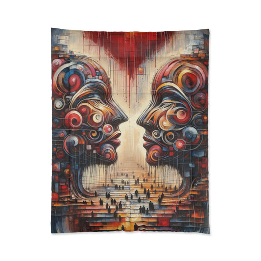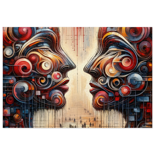 Titled Unity Heartfelt Communication, this vertical image is a visually striking Tachism style painting that symbolically represents the concept of heartfelt communication as the key to unity. At the center of the composition are two profiles facing each other, seemingly engaged in an intimate exchange. Their faces are not depicted with traditional realism but are instead composed of dynamic, swirling patterns and bold segments in a variety of warm earthy tones, reds, and blues, highlighting the complexity and depth of human interaction and emotion. Above the profiles is a large, stylized heart, partially blending into the background yet clearly visible through its vibrant red and orange hues. The heart appears to be bleeding, with red streaks descending from it, possibly signifying the vulnerability and passion inherent in open, honest communication. In contrast to the intimacy suggested by the heart and profiles, the bottom section of the artwork displays a multitude of small, indistinct human figures on what looks like a series of steps or a landscape made up of hues that reflect those used in the profiles and heart. This multitude could represent society at large and how the idea of unity spreads beyond the individual, impacting the collective. The painting exudes a sense of harmony despite the abstract forms, implying a connection between the personal exchange between individuals and the broader concept of communal coherence and accord. The artwork is rich with texture, featuring drips, layers, and an evocative interplay of color and form, evoking a powerful sense of emotion and thought about