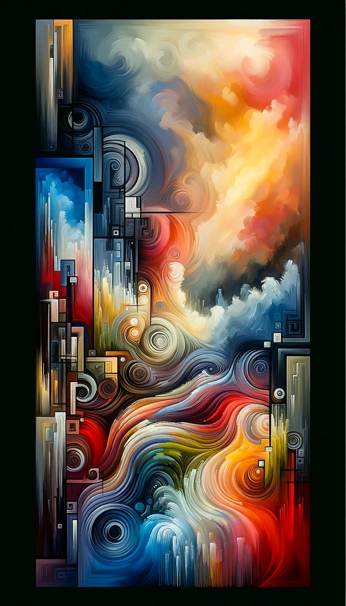 Tuning Essence Abstract is a captivating vertical Tachism style painting that exudes the profound qualities of attunement, mindfulness, and deep connection. The artwork showcases a masterful blend of vibrant colors and dynamic shapes, creating a harmonious yet complex visual symphony. The left side is marked by a confluence of geometrical patterns and straight lines in varying shades of blue and grey, suggesting structure and order. This segment resembles a cityscape or an architectural blueprint, where the precision of design reigns. Transitioning towards the center and right of the canvas, the painting transforms into an array of swirling, organic patterns. These forms mimic the fluidity and unpredictability of the natural elements like water and air. An impressive spectrum of colors, from deep blues to fiery reds and luminous yellows, evokes the changing times of day or seasons, inferring a temporal passage. This stark contrast between the regimented left and the free-flowing right symbolizes the balance between the rational and the emotional, the mind s clarity, and the heart s warmth. As such, the painting stands as a symbolic journey through the layers of consciousness, inviting the observer to delve into a state of reflective immersion, embracing the intertwining dance of thought and feeling.
