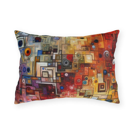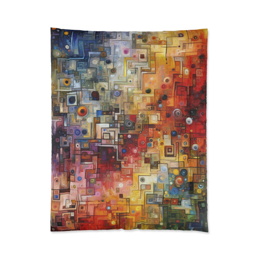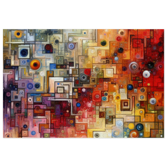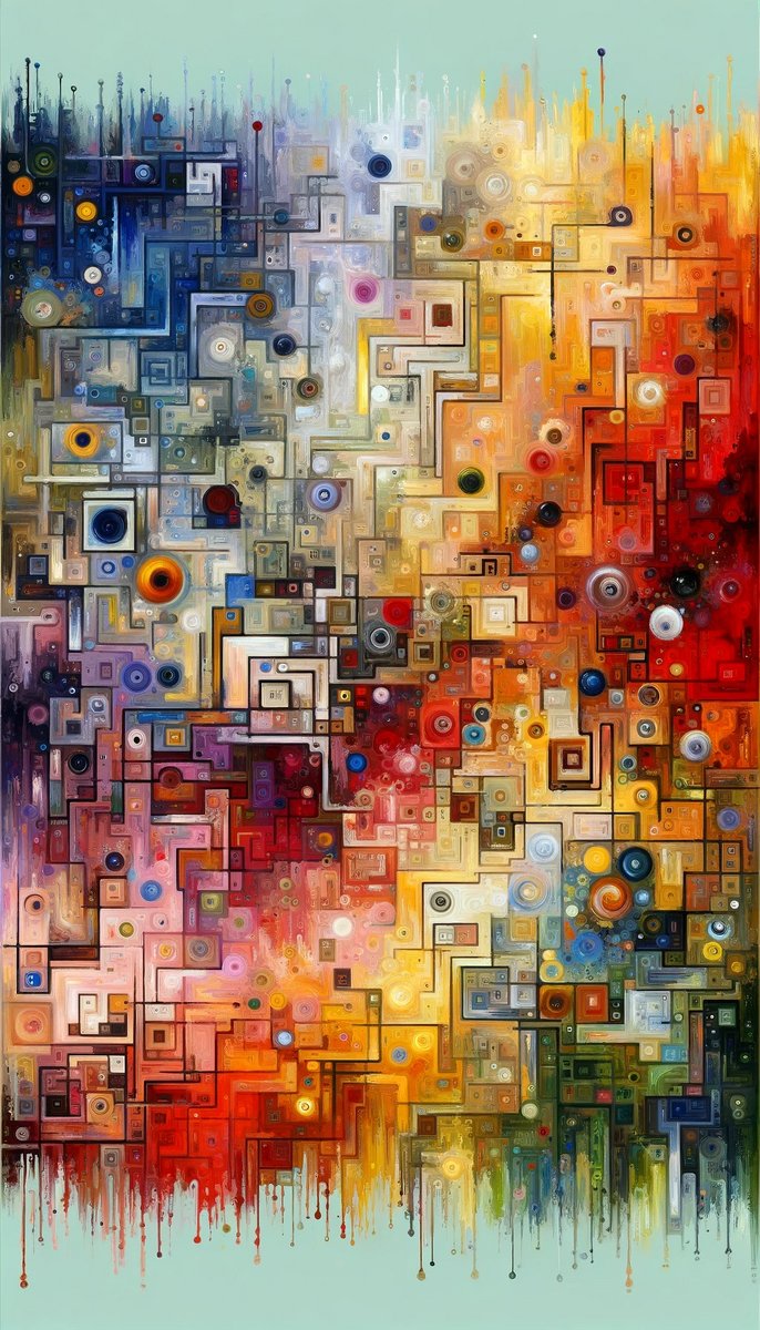 Titled Witty Conversation Tapestry, this vertical image is a vibrant display in the Tachism style, inviting the viewer to explore the intricacies of dialogue through a visual metaphor. The tapestry s composition is a complex array of geometric and organic shapes, reminiscent of both the order and chaos inherent in spirited conversations laced with humor and witticism. The color palette transitions from cool blues at the top into warm oranges and reds towards the bottom, possibly symbolizing the changing tones and moods of conversation. Sporadic circles and dots scattered across the canvas could represent the bright moments of levity and the surprising sparks of insight that occur when wit infuses exchanges between individuals. In some areas, the shapes form strict grids, evoking structured debate or rehearsed repartee, while in others, the patterns disperse and overlap fluidly, alluding to the spontaneity of improvised banter. The occasional streaks that cascade downwards like drips add a dynamic sense of motion, underlining how a single quip can change the direction of a discussion or leave a lasting impression long after words fade away. Overall, the artwork is a symphony of abstraction that captures the essence and energy of conversational threads being woven into a rich, multifaceted tapestry of exchange and intellect.