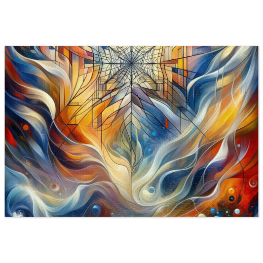 The image titled Weaving Renewal Web is a captivating vertical Tachism style painting that visually embodies the theme of renewal. Dynamic and fluid brushstrokes in a warm spectrum of oranges, reds, and cool blues create a sense of turbulent movement across the canvas. The painting evokes the impression of transformative forces at work, as if the very fabric of nature is being rewoven into a new tapestry of existence. Central to the composition is a complex, web-like structure that draws the eye toward a radiant convergence point, suggesting a focal moment of rebirth or regeneration. The intricate web appears to be woven by the sweeping lines and shapes that gracefully flow around it, giving the impression of an organic and continuous process of change. The interplay of light and color gradations enhances the depth of the image, highlighting the transition from darkness to light, underscoring the concept of emergence from old to new. Abstract elements reminiscent of cells or organic matter can be seen throughout the layers of paint, hinting at the microscopic level of life s renewal. This artwork is rich in symbolism and speaks to the boundless potential for growth and revitalization inherent in the natural world as well as in the human spirit. It captures the essence of rebirth, reminding viewers of the beauty and possibility that accompanies cycles of change and renewal.