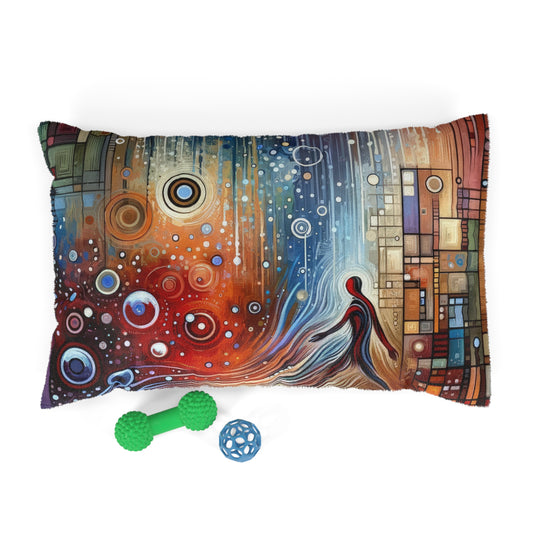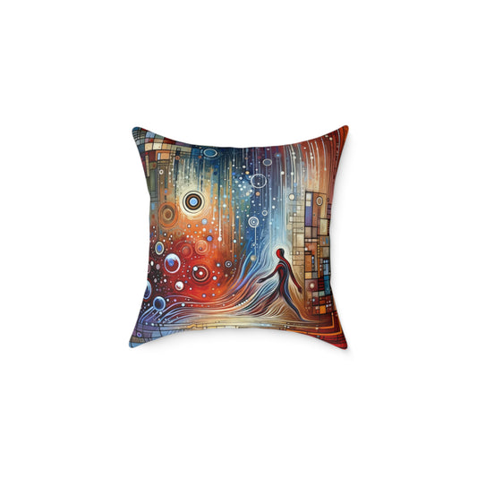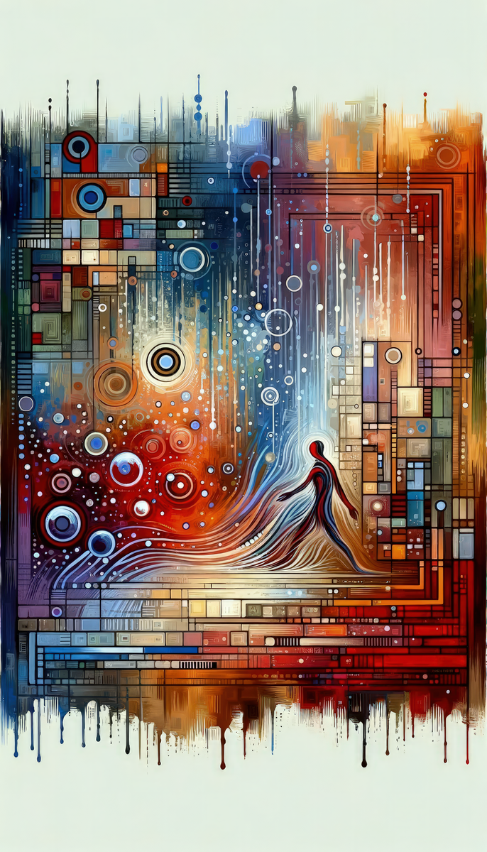The image titled Advocate Ethos Connectivity depicts an abstract vertical canvas pulsating with a confluence of color and form. It embodies the Tachism style, an art movement characterized by spontaneous and intuitive paint application, which here seems to symbolize the dynamic nature of advocacy and the interconnectedness of a living creed. At the heart of the composition, a central figure emerges, rendered as a human-like silhouette in red and white, surrounded by swirling patterns that suggest movement and flow. This figure appears to be merging with or arising from the abstract landscape, perhaps illustrating the concept of an individual embodying a set of beliefs so wholly that the distinction between advocate and ethos becomes blurred. Surrounding the figure, a myriad of geometric shapes and lines converge in harmonious disarray. Blocks of color - vivid blues, robust reds, and calming grays - interact with organic circles and elongated drips of paint that traverse the canvas vertically, evoking the feeling of connectivity reaching beyond the physical space. The dripping effect gives the whole a sense of dissolution and creation, as if ideas and convictions are being both formed and shared. The upper part of the artwork dissolves into a haze of cooler tones and undefined shapes, a visual metaphor for concepts and ideals that are always in process, never completely finite. The piece seems to invite the viewer to reflect on their own beliefs and their role as advocates within the tapestry of collective human thought and action.