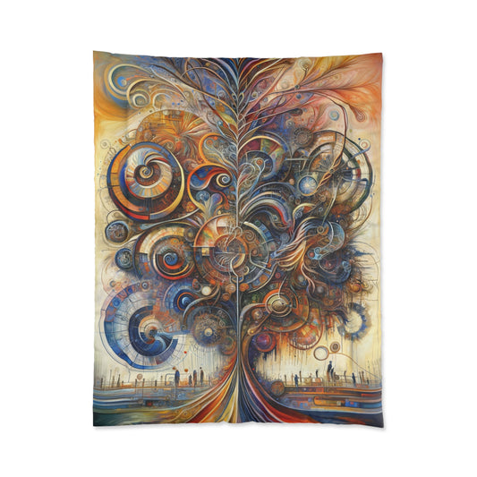 The image titled Ethos Web Abstract is a striking, vertical Tachism-style painting teeming with vibrant colors and intricate details. The imagery conjures the sense of a food web, symbolizing the complex relationship between individual actions and the collective ethos. At the heart of the work is an organic, tree-like structure that serves as the painting s spine, with branches that transform into fluid, abstract shapes. This central motif is surrounded by a multitude of swirling patterns, resembling mechanical cogs, spirals, and celestial orbs, which merge organically with more ethereal, fluid designs. The color palette consists of rich, warm hues of gold, orange, and red cascading into cooler tones of blue, alluding to the dynamic interactions within a community or ecosystem. The symmetry and balance in the composition suggest a mirroring effect or duality, pointing towards a philosophical interpretation of how individual contributions reflect and impact the broader social fabric. The fine, detailed linework throughout the piece, combined with bold, sweeping gestures, creates a sense of depth and movement, drawing the viewer s eye across the canvas. This interplay of color, form, and symbolism makes Ethos Web Abstract a visually captivating representation of the interconnectivity that defines both natural and human-designed systems.
