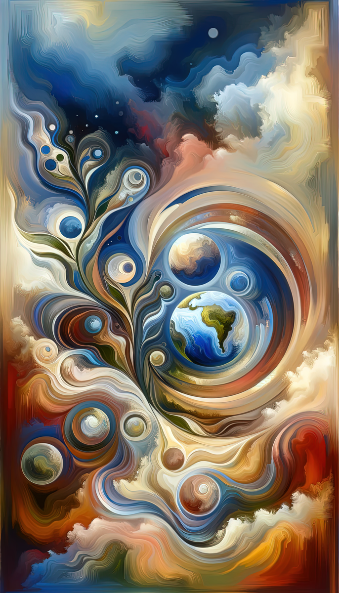 The artwork titled Esoteric Nurturing Gaia is a Tachism style painting that depicts an abstract, fluid amalgamation of colors and forms. The predominant feature of this painting is the swirling motif that appears to center around a representation of the Earth. This central element incorporates shades of blue, green, and white to symbolize the planet, highlighting the continents of North and South America visible amidst the whirl of colors. Surrounding the Earth motif are circular patterns rendered in a variety of hues that seem to dance and ripple outwards. These concentric rings suggest a dynamic movement, perhaps conveying the ongoing cycles of nature and the interconnectedness of life. The palette transitions from cool blues and bright whites at the top, symbolizing the sky and outer space, through warm oranges, reds, and creamy tones towards the bottom, evoking the earth and perhaps the molten core or the nurturing soil. In the upper section of the composition, darker blues and blacks contrast with lighter areas, possibly indicating the vastness and mystery of the cosmos with scattered stars or distant planets. The colors blend and interact in a way that might suggest the continuous flow of energy and the essence of nurturing. The use of swirling forms and an earth-centric visual narrative in the painting could be interpreted as a reflection on the intrinsic importance of caring for our planet. The esoteric aspect is embodied in the painting’s fluid abstraction, which invites contemplation on the deeper, less tangible elements of our relationship with the environment,