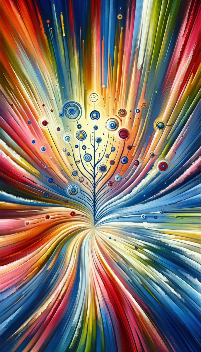 The Sustainable Ripple Abstract is a Tachism style vertical painting, vibrant with symbolism related to the echoing impacts of sustainable daily choices. At the core of the image is a convergence point from which a plethora of multicolored, ray-like lines emanate – each streak a different hue, suggesting diversity in the spectrum of individual actions leading to sustainability. The lines stretch outward, getting lighter in color as they extend towards the edges of the canvas, creating a ripple effect that symbolizes the far-reaching consequences of small, consistent efforts toward environmental preservation and responsible living. Amidst this burst are circular patterns, akin to ripples in water, in varying sizes and colors. The circular motifs, some solid and some more like concentric rings, are strategically placed all along the radiating lines. They represent ideas, initiatives, and the spread of sustainable practices as they ripple outwards into society and influence a broader scope. The painting is marked by a dynamic interplay between sharp streaks and these softer circular forms. This juxtaposition mirrors the way tangible actions (the streaks) can reverberate through communities and ecosystems (the ripples) in profound and often unseen ways. The overall effect is one of hope and interconnectedness, leaving the viewer with a sense of the possibilities that lie in the collective, sustainable actions of individuals and communities.