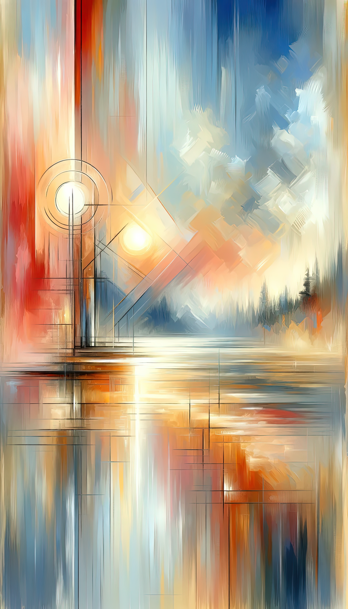 This is an evocative vertical painting entitled Simplicity Symphony Harmony, which is steeped in the Tachism style of abstract art. The canvas captures the very essence of simplicity and harmony through an array of softly blended hues and bold streaks of color. The composition is divided into warm and cool tones, featuring a juxtaposition of fiery reds and oranges against tranquil blues and whites. In the painting s center, a geometric arrangement of lines and circles introduces a hint of structure amidst the fluidity of its surroundings. This central motif suggests an otherworldly sun, with emanating rays intersecting with the vertical and horizontal elements, perhaps symbolizing the order and rhythm found within the natural chaos of life. The bottom half of the artwork subtly reflects the scene above, as if it were cast upon the surface of still water, with the colors melting into each other creating a serene, mirror-like effect. The blurring of lines and merging of colors evoke a sense of peace and continuum. The landscape background, though abstractly rendered with sweeping brushstrokes, evokes the silhouette of a distant, tranquil skyline or a forest at dusk or dawn. The luminescence of a round, sun-like form bathes the scene in a soft, ethereal light, further enhancing the harmony of the piece. Simplicity Symphony Harmony resonates with emotional depth, the visual representation of stillness and balance achieved through a symphony of simple, yet dynamic, elements.